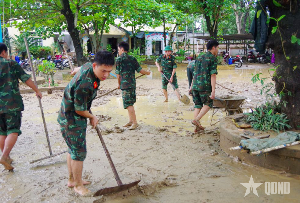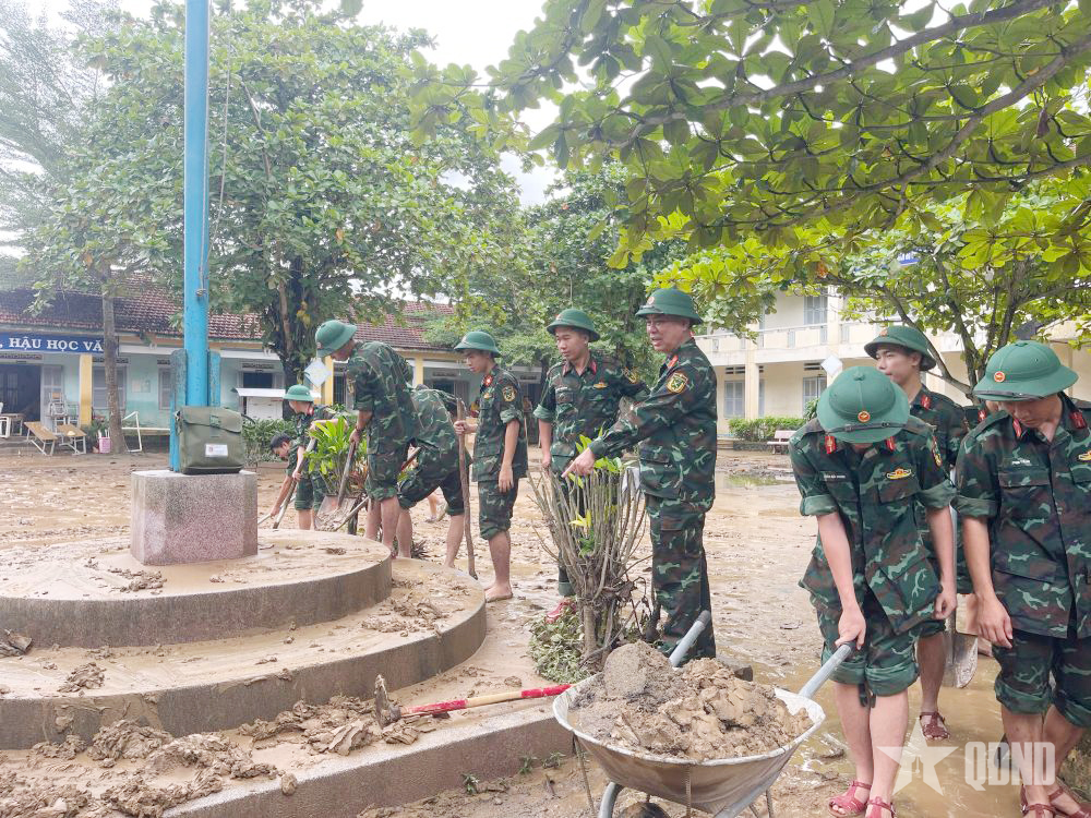 Cán bộ, học viên Trường Sĩ quan Thông Tin hỗ trợ nhân dân dọn dẹp sau lũ tại các điểm trường.