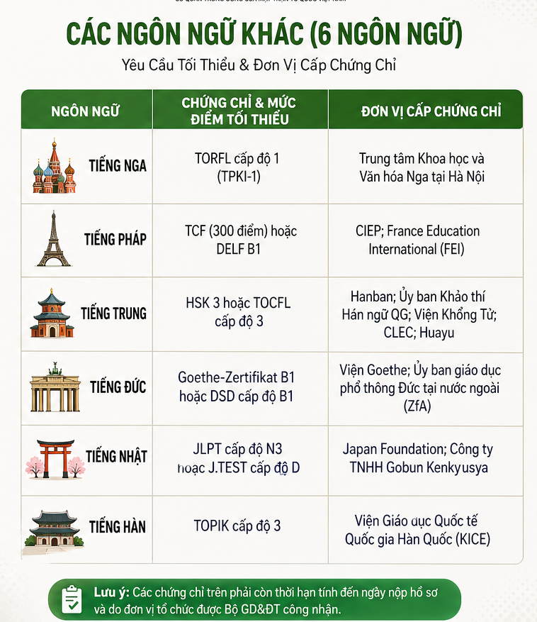 Bên cạnh đó, thí sinh cần kiểm tra kỹ loại chứng chỉ, mức điểm và thời hạn hiệu lực theo danh mục được chấp nhận. Việc khai báo sai hoặc sử dụng chứng chỉ không còn giá trị có thể ảnh hưởng trực tiếp đến quyền lợi xét tốt nghiệp.