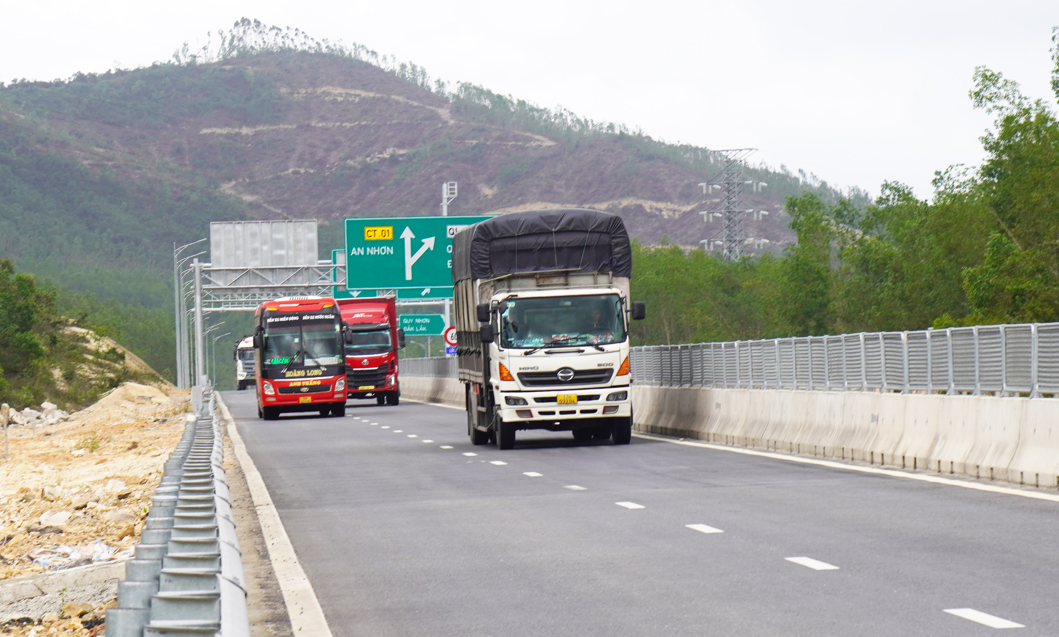Các xe khách, xe tải lưu thông vào đường cao tốc điểm đầu dự án thành phần Quy Nhơn - Chí Thạnh