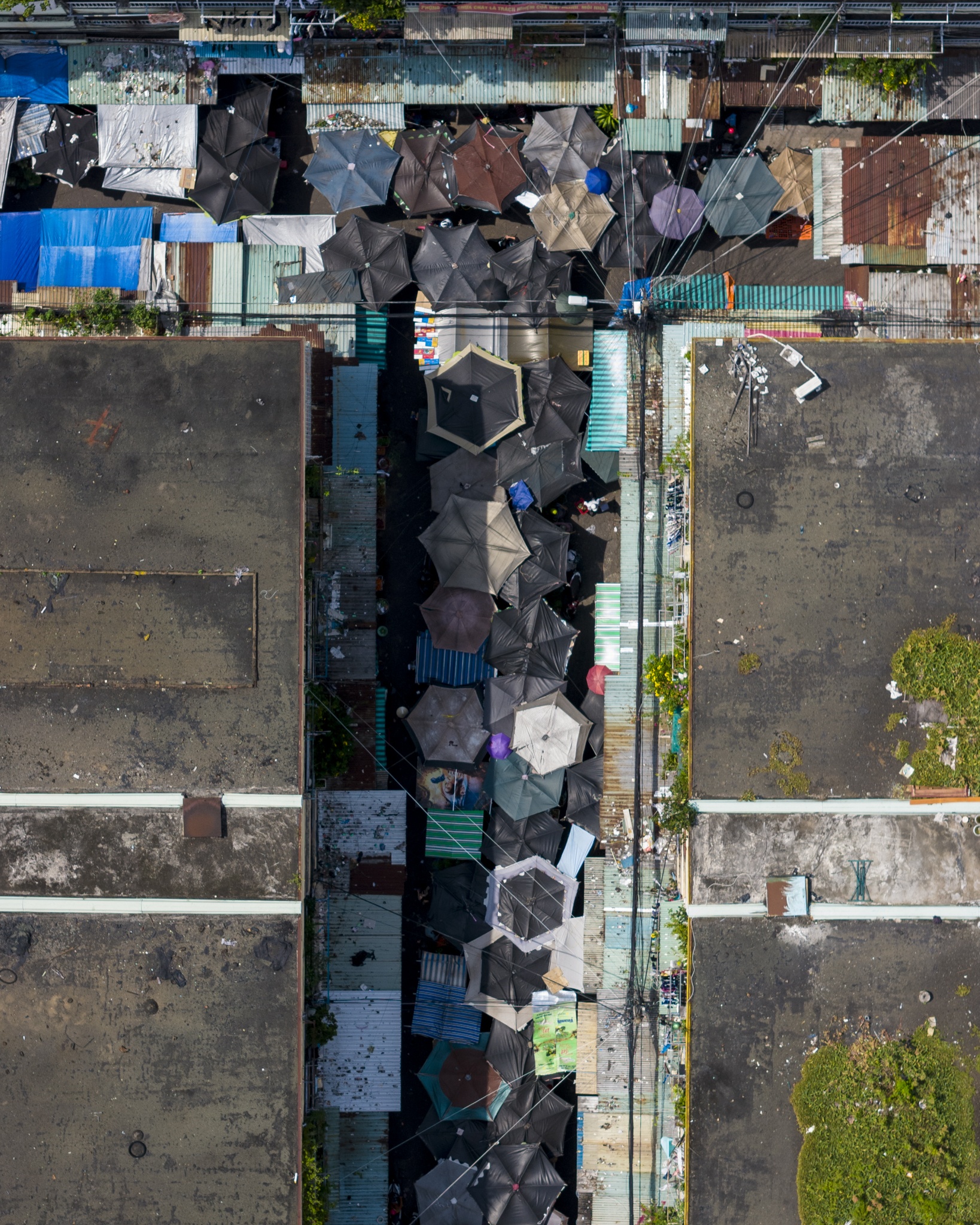Ngay phía dưới lô O, N, I là khu vực chợ tự phát. Ô dù giăng khắp nơi không thấy lối đi.