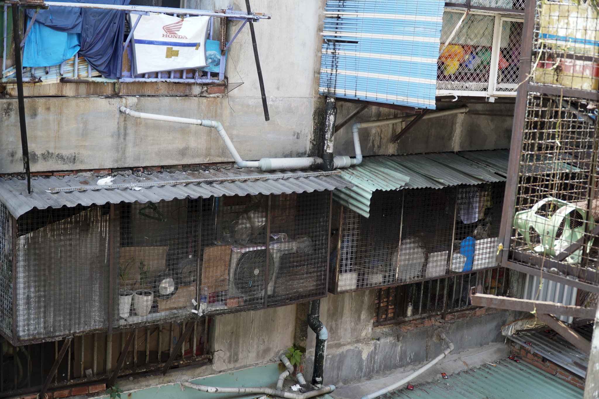 Nhiều hạng mục tại 17 lô chung cư đã hư hỏng, xuống cấp. Người dân cơi nới thêm các "lồng sắt" phía sau nhà để tăng diện tích sử dụng.