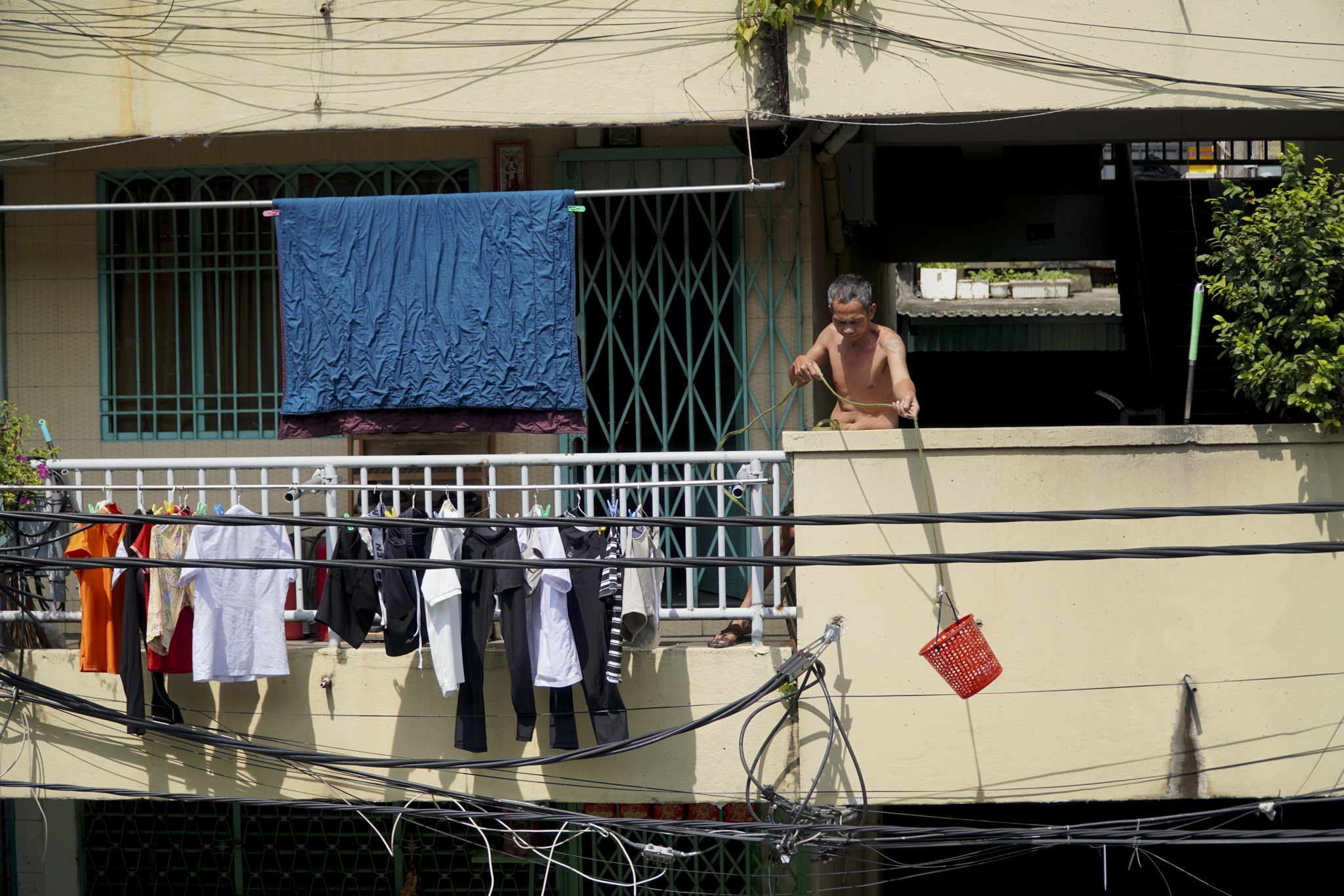Mỗi lô tại chung cư Ngô Gia Tự được thiết kế 1 trệt, 3 lầu. Bên ngoài, những bó dây điện chằng chịt như mạng nhện giăng khắp nơi.