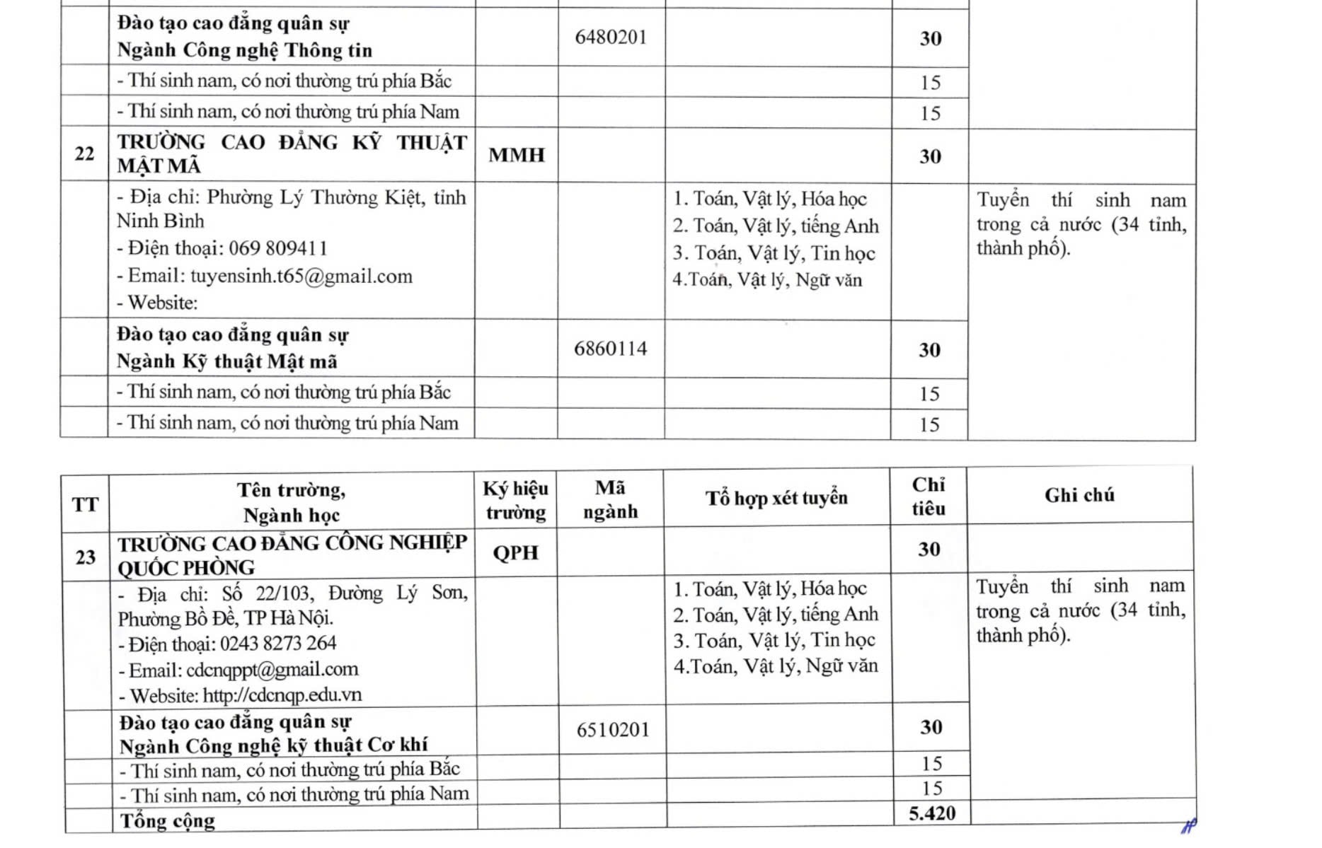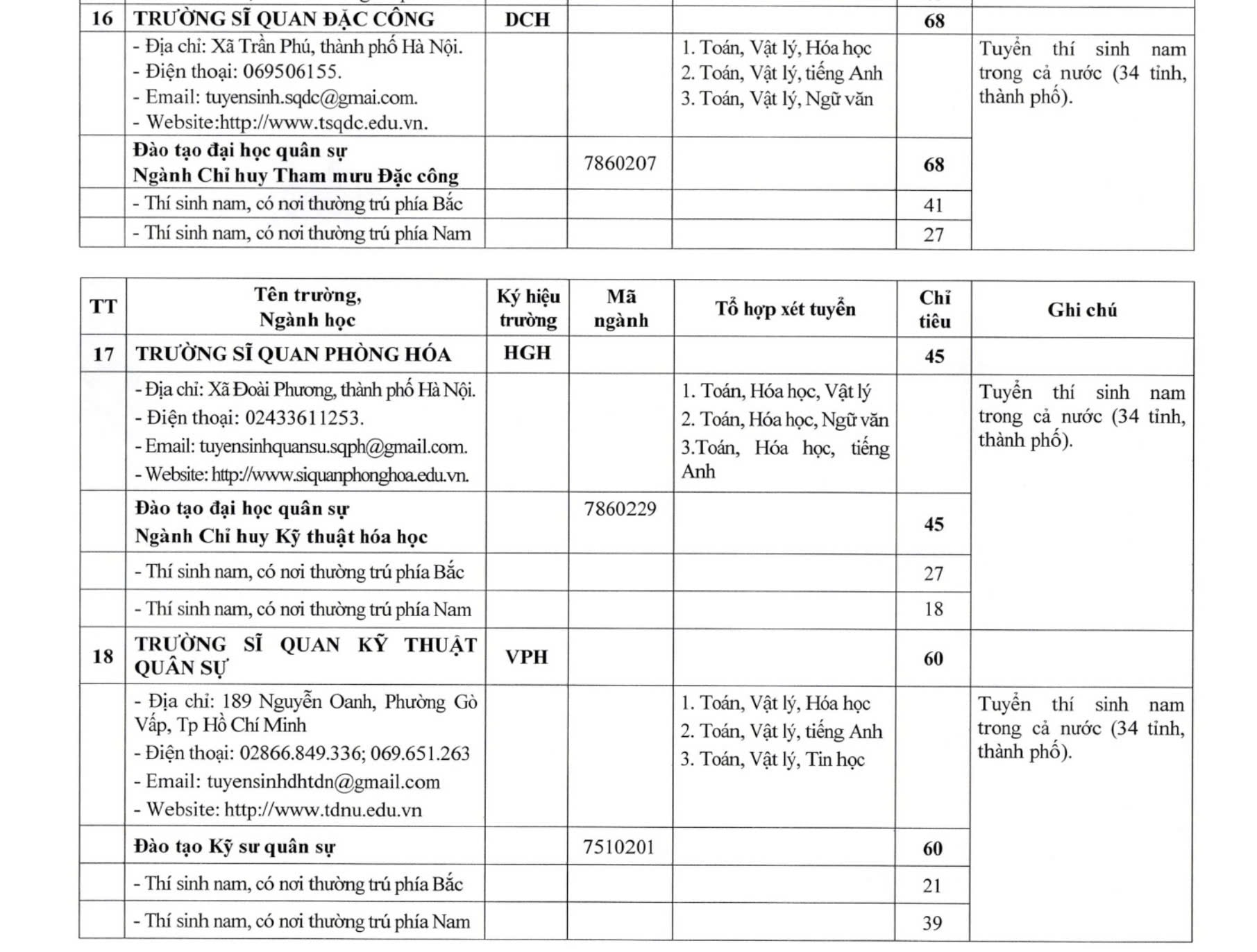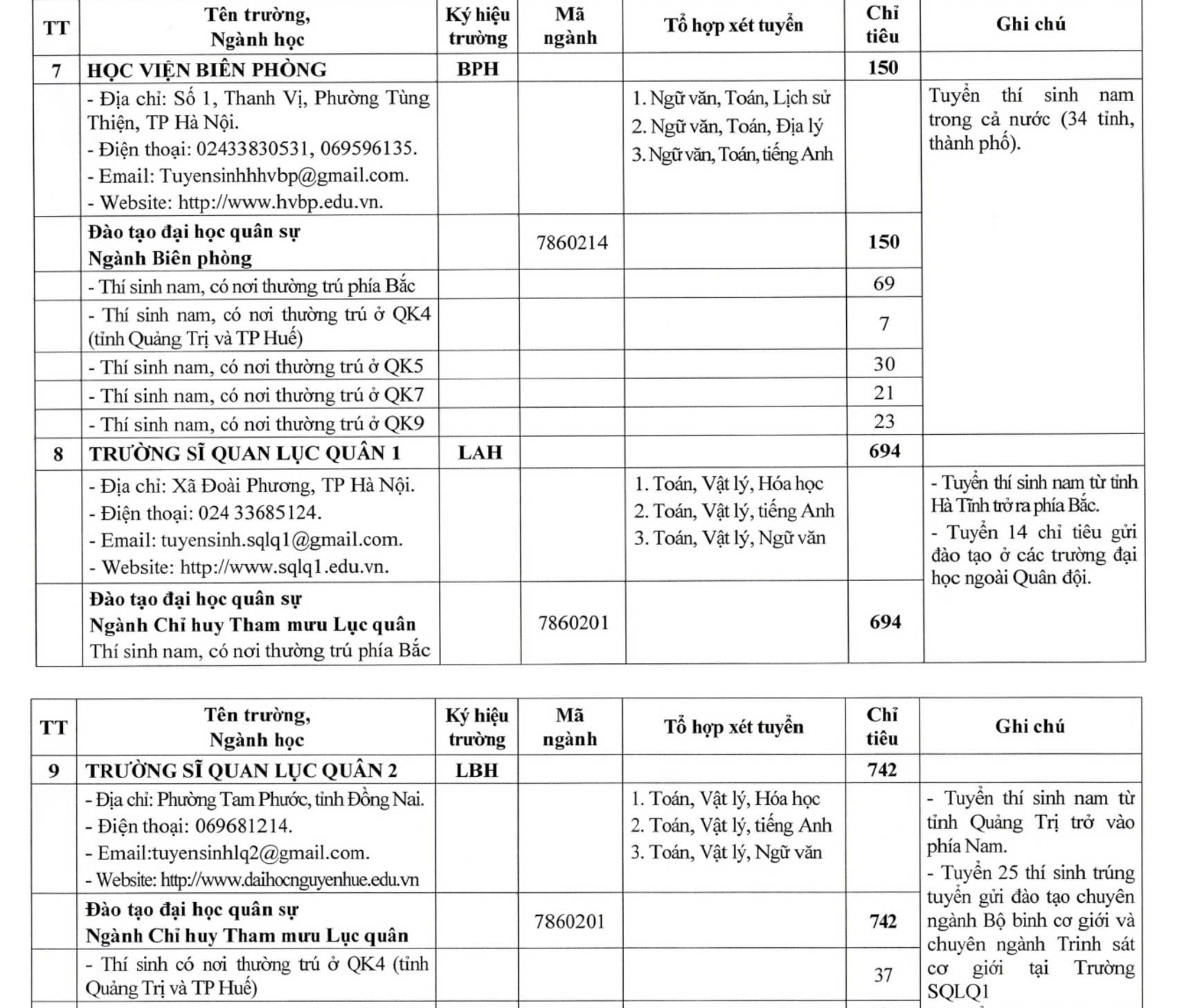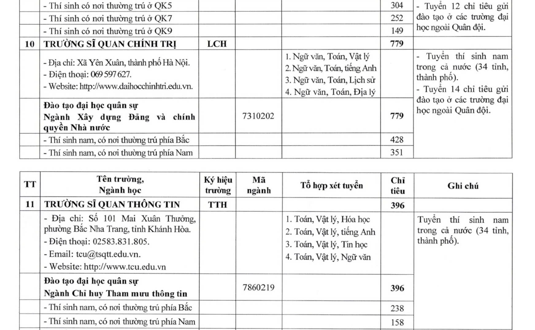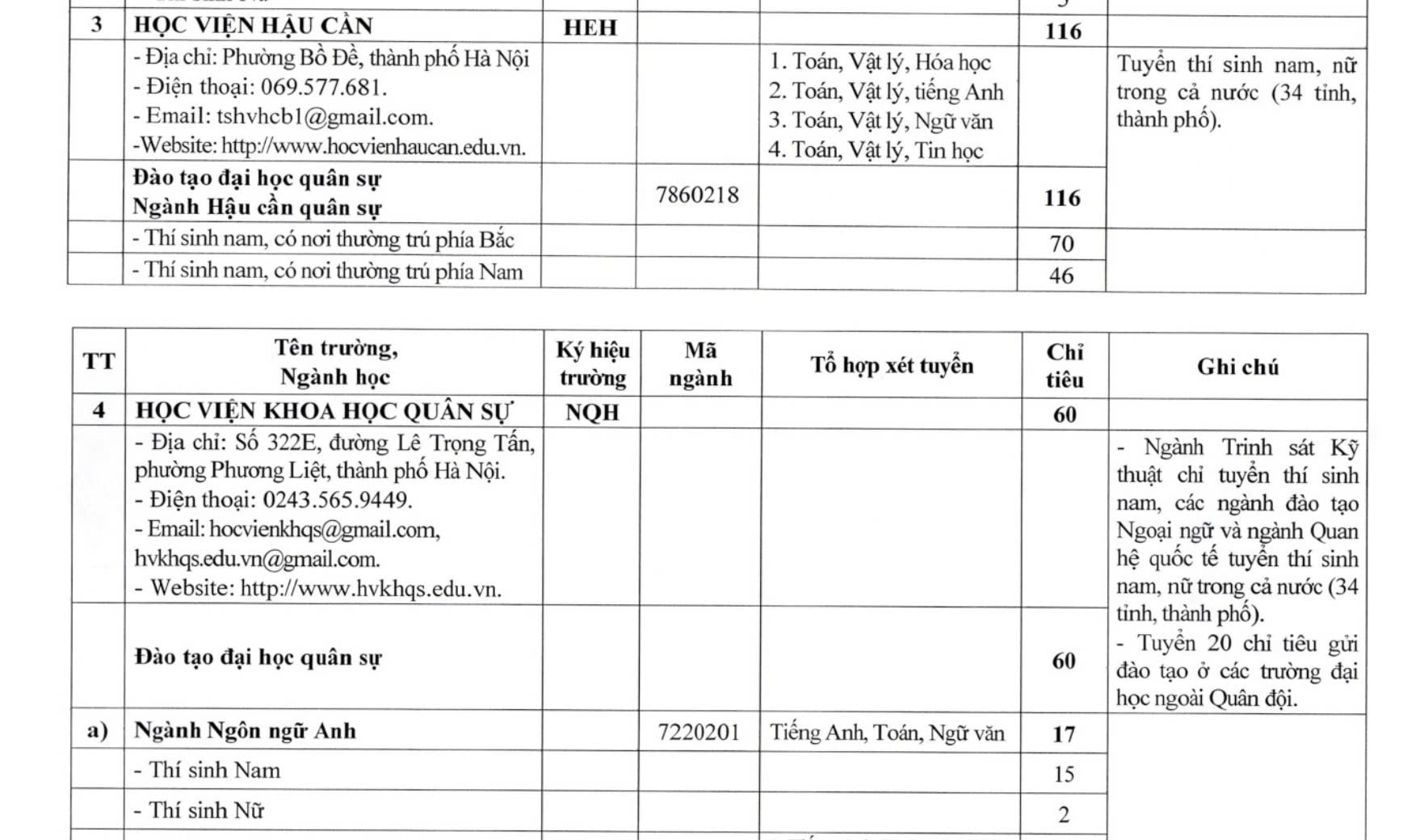 Năm 2026, 23 học viện, trường sĩ quan trong Quân đội tuyển sinh hơn 5.400 chỉ tiêu đào tạo đại học và cao đẳng hệ quân sự chính quy, tăng khoảng 1.000 chỉ tiêu so với năm 2025.