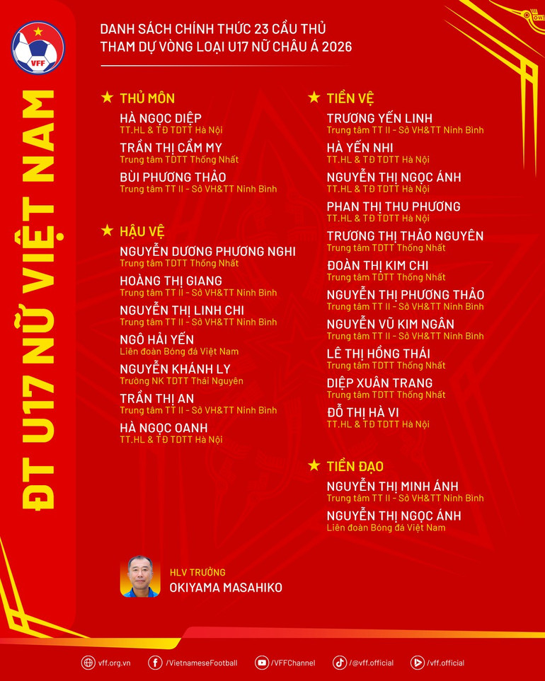 Danh sách 23 cầu thủ U17 nữ Việt Nam tham dự Vòng loại U17 nữ châu Á 2026. (Nguồn: VFF)