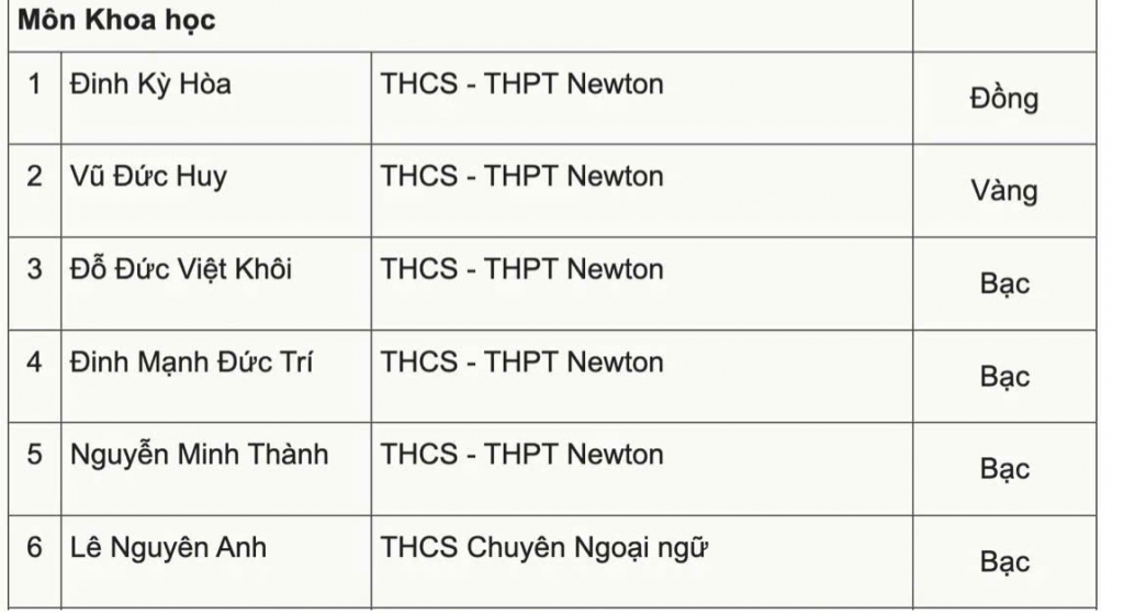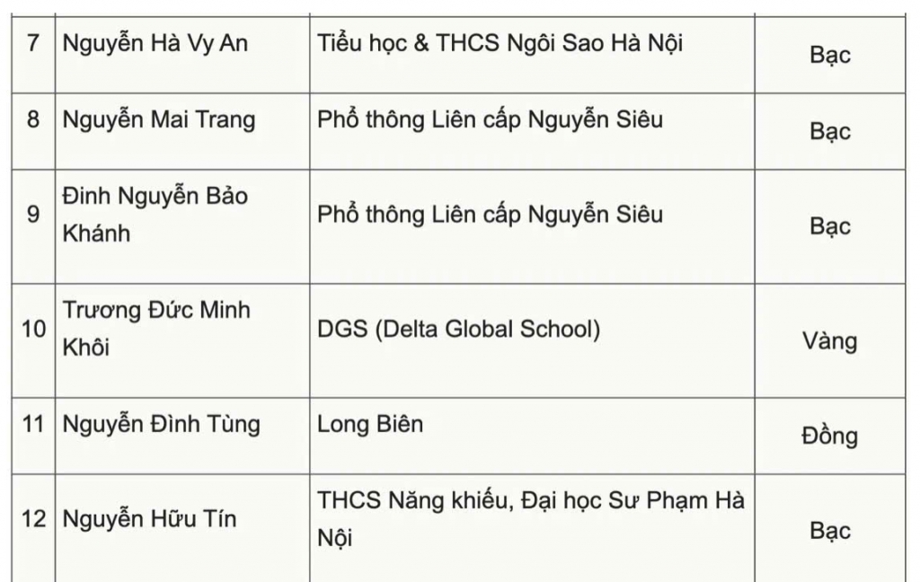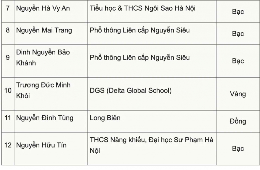 Còn lại có 15 học sinh đoạt huy chương Bạc, 4 em giành huy chương Đồng. So với năm ngoái, số huy chương Vàng giảm 3, huy chương Bạc tăng 1.