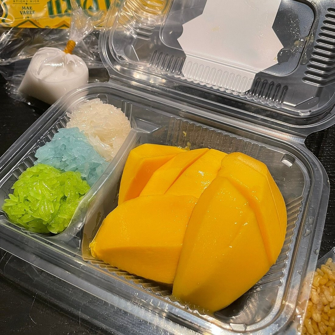Sau bữa chính, đừng quên món tráng miệng “quốc dân” – xôi xoài Mae Varee (1 Sukhumvit 55, Thonglor). Từng hạt xôi dẻo thơm, ăn cùng xoài chín vàng và nước cốt dừa béo ngậy, đơn giản nhưng tinh tế, đủ khiến du khách “phải lòng” ẩm thực Thái ngay từ lần đầu thưởng thức. Ảnh Tripadvisor