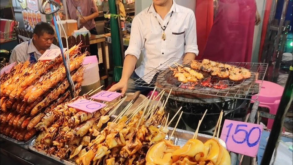 Khi nắng tắt, chợ Pratunam trở nên nhộn nhịp với hàng dài quầy nướng nghi ngút khói. Chỉ từ 10 – 25 THB/xiên (7.000 – 17.000 VNĐ), du khách có thể thưởng thức đủ loại món như thịt heo xiên, mực, xúc xích hay cá viên chiên. Ảnh haidangtravel