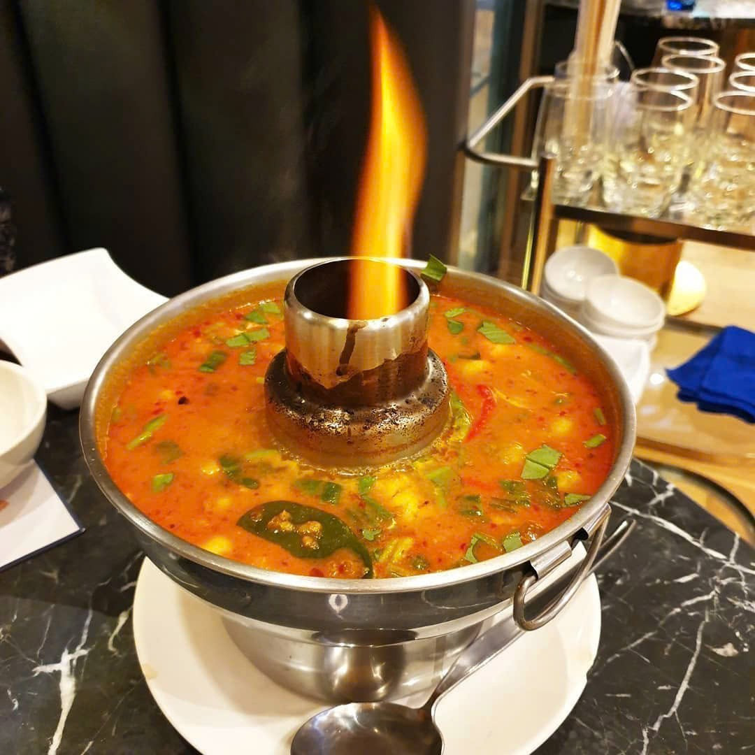 Khi màn đêm buông xuống, Bangkok bước vào “thời khắc vàng” của ẩm thực. Ở Rod Fai Night Market (Srinakarin Soi 51), du khách sẽ bị chinh phục bởi nồi lẩu Tom Yum cay chua đặc trưng. Nước lẩu sôi sùng sục với hương sả, lá chanh, vị cay nồng và tôm tươi ngọt thịt tạo nên trải nghiệm “bùng nổ vị giác” khó quên. Ảnh Internet