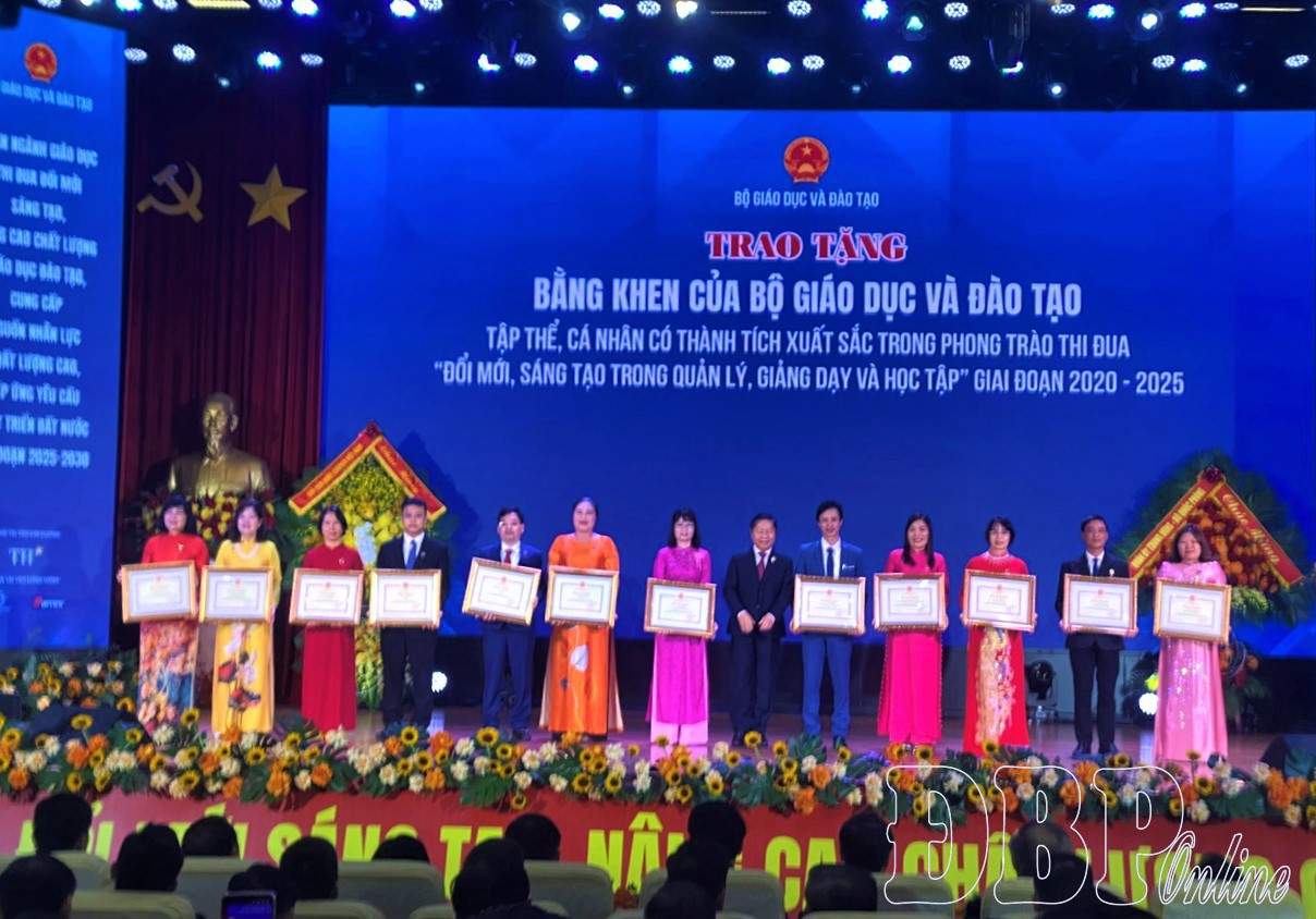 Thầy Trần Bá Uẩn (thứ 5 từ trái sang) nhận Bằng khen của Bộ Giáo dục và Đào tạo. Ảnh NVCC