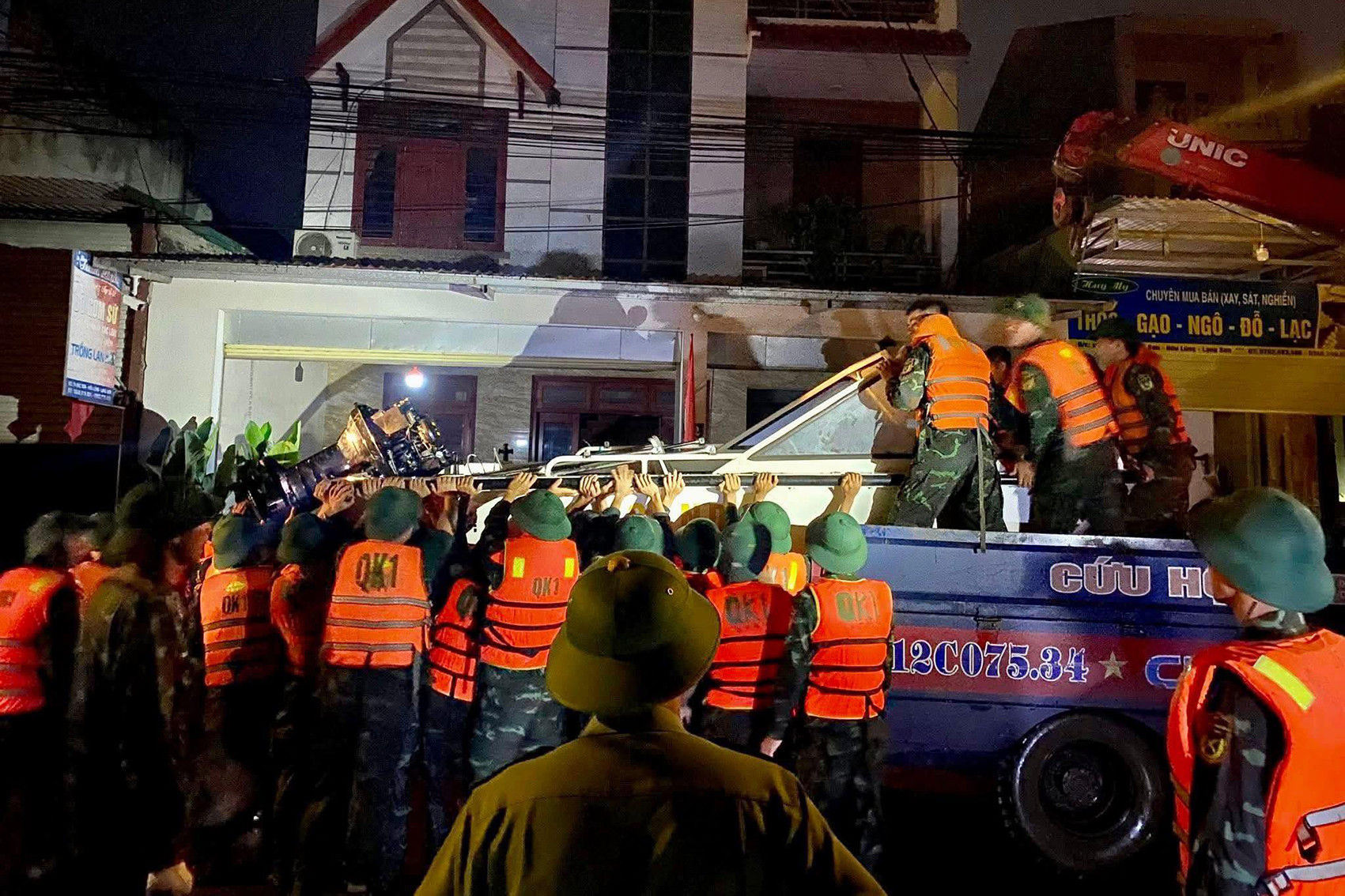 Lực lượng Công an xã Hữu Lũng hỗ trợ người dân tới nơi an toàn. Ảnh: Công an xã Hữu Lũng