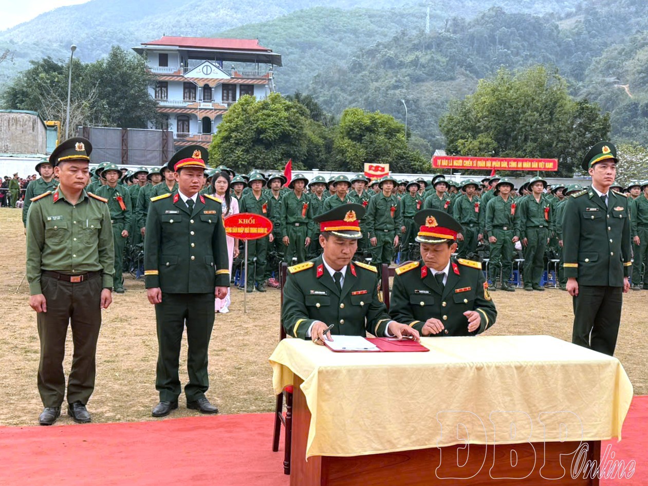 Các đơn vị ký kết biên bản giao nhận quân tại điểm giao nhận quân số 2 Na Sang.