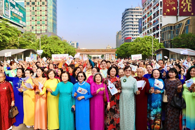 Sáng 8/3, Sở Du lịch TPHCM phối hợp với Hội Liên hiệp Phụ nữ TPHCM tổ chức chương trình đồng diễn dân vũ và diễu hành áo dài tại phố đi bộ Nguyễn Huệ (phường Sài Gòn), thu hút 3.000 người tham gia.
