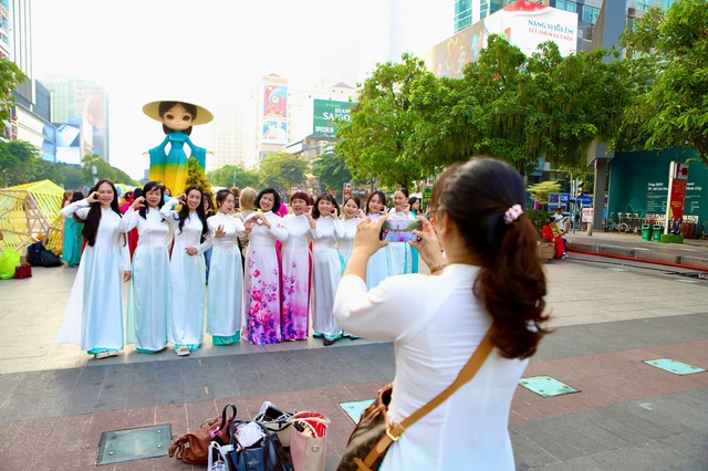 Du khách quốc tế mặc áo dài để tham dự chương trình đồng diễn dân vũ và diễu hành áo dài tại phố đi bộ Nguyễn Huệ.