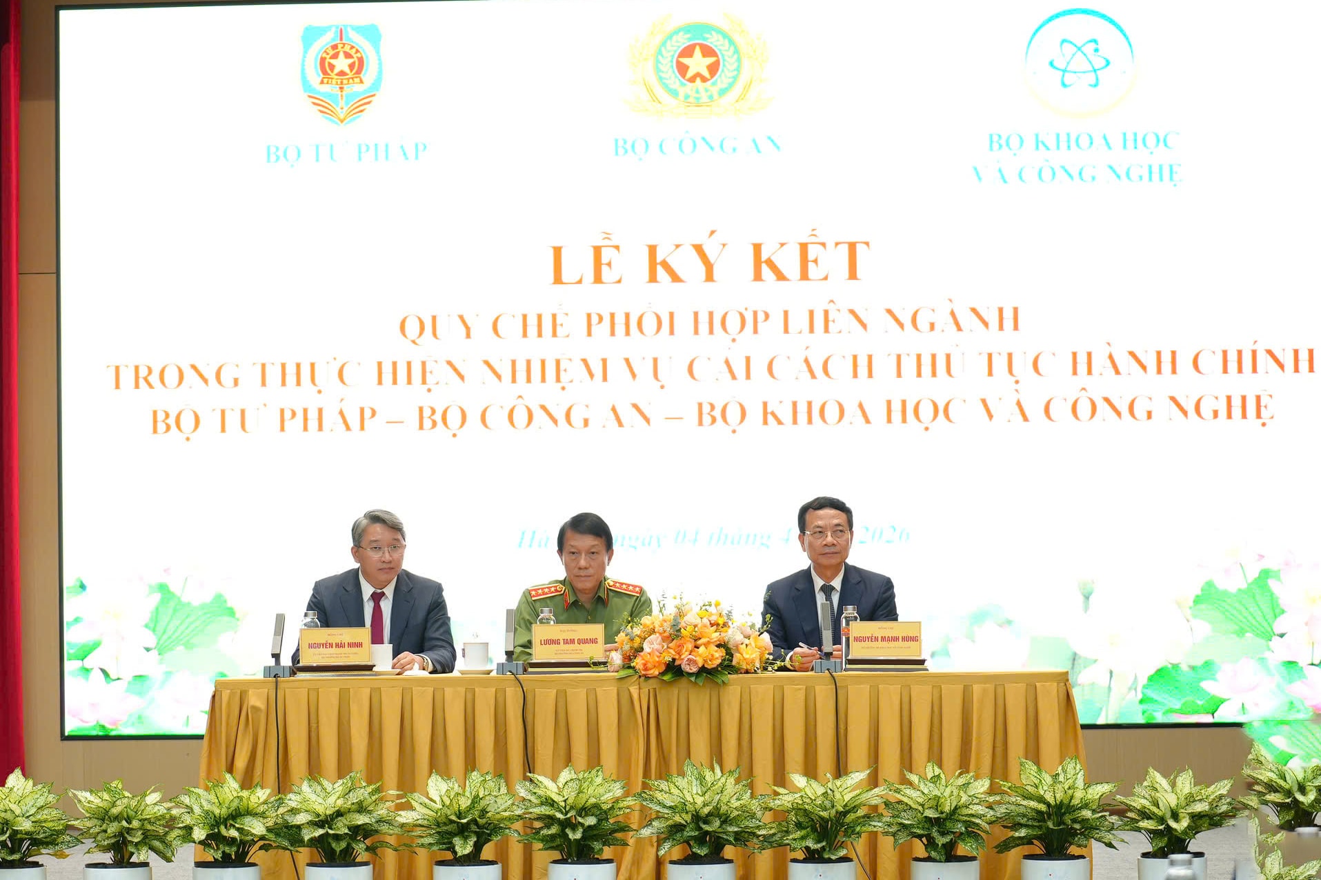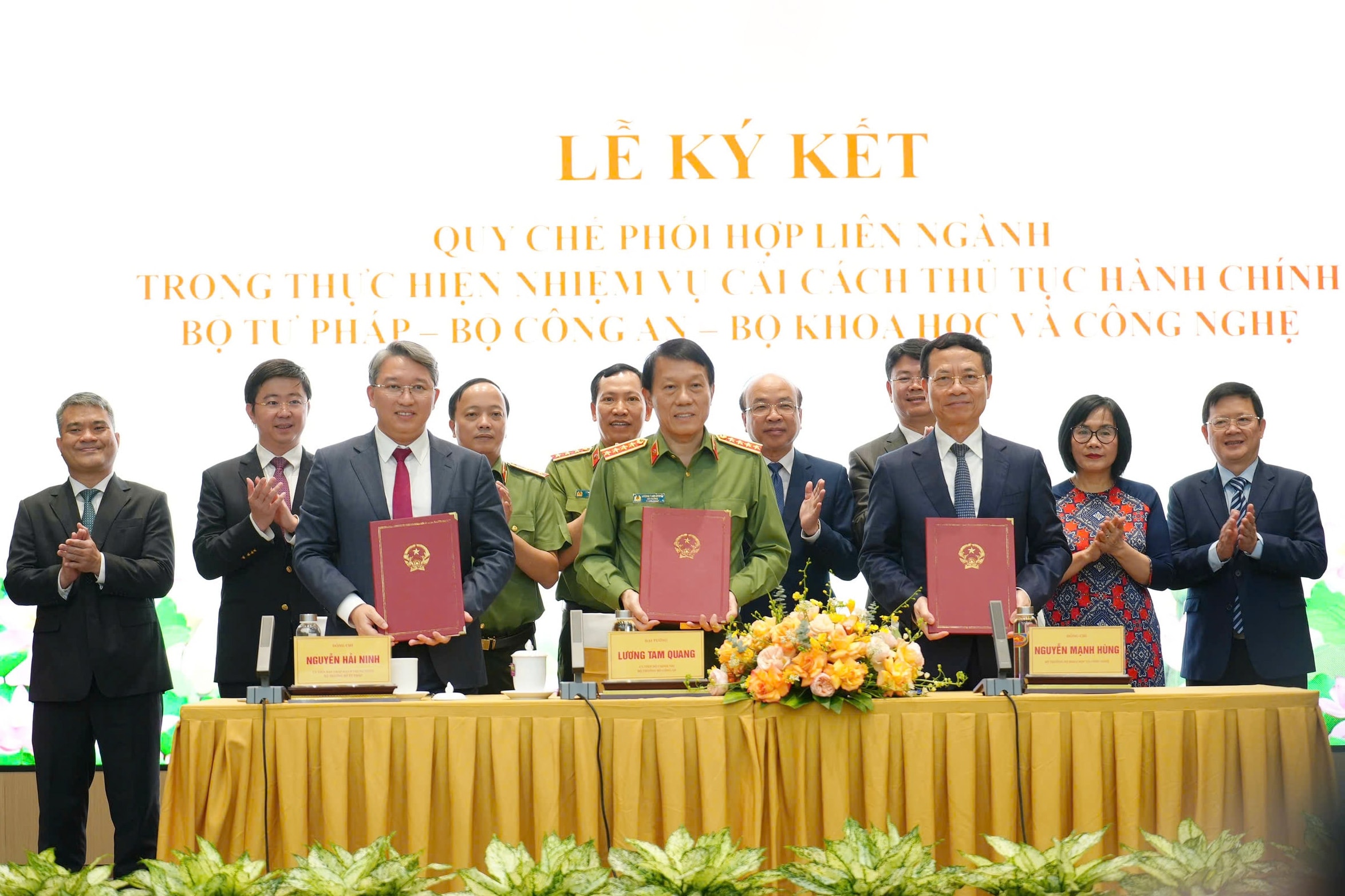 Bộ trưởng Bộ Công an, Đại tướng Lương Tam Quang; Bộ trưởng Bộ Tư pháp Nguyễn Hải Ninh; Bộ trưởng Bộ Khoa học và Công nghệ Nguyễn Mạnh Hùng đồng chủ trì Lễ ký kết