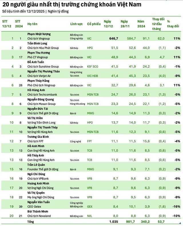 Tính đến ngày 12/12/2025, tổng giá trị tài sản của Top 20 người giàu nhất sàn chứng khoán Việt Nam đạt hơn 1 triệu tỷ đồng, tăng hơn 53.700 tỷ đồng so với cuối tháng 11 và chủ yếu đến từ nhóm gia đình Chủ tịch Vingroup.