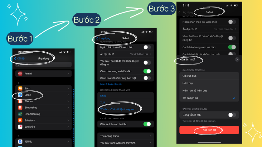 Mở Cài đặt -> Ứng dụng. Cuộn xuống Safari và chạm vào đó. Tìm và nhấn vào Xóa lịch sử và dữ liệu trang web. Chọn khung thời gian (đề xuất chọn Toàn bộ lịch sử). Nhấn Xóa lịch sử để xóa lịch sử, cookie và bộ nhớ đệm.