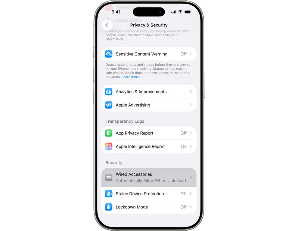 Để hạn chế rủi ro bị đánh cắp dữ liệu, người dùng iPhone có thể vào Settings (cài đặt) - Privacy & Security (quyền riêng tư và bảo mật) - Wired Accessories (phụ kiện có dây), sau đó thiết lập lại thành Always Ask (luôn hỏi) hoặc Always for new accessories (luôn hỏi phụ kiện mới) thay vì tự động cho phép.