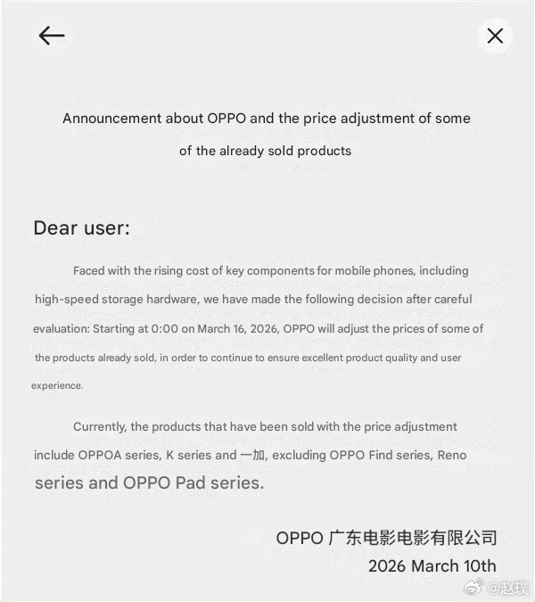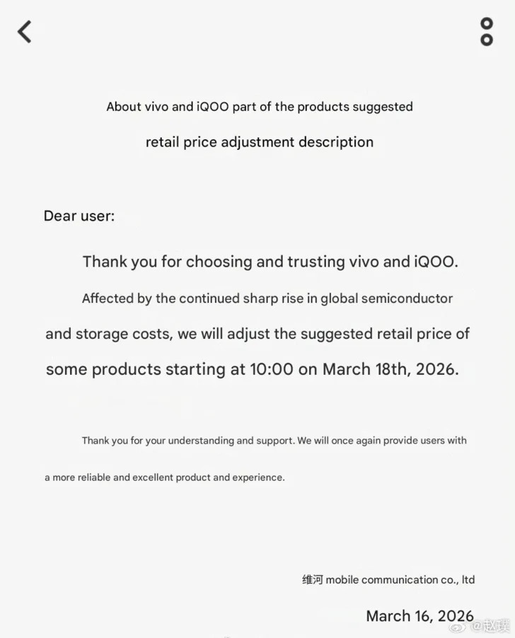 Không chỉ OPPO và OnePlus, vivo và thương hiệu con iQOO cũng đã thông báo tăng giá một số thiết bị từ ngày 18-3 tại Trung Quốc. Việc điều chỉnh chủ yếu áp dụng cho các mẫu đang bán tại thị trường nội địa.