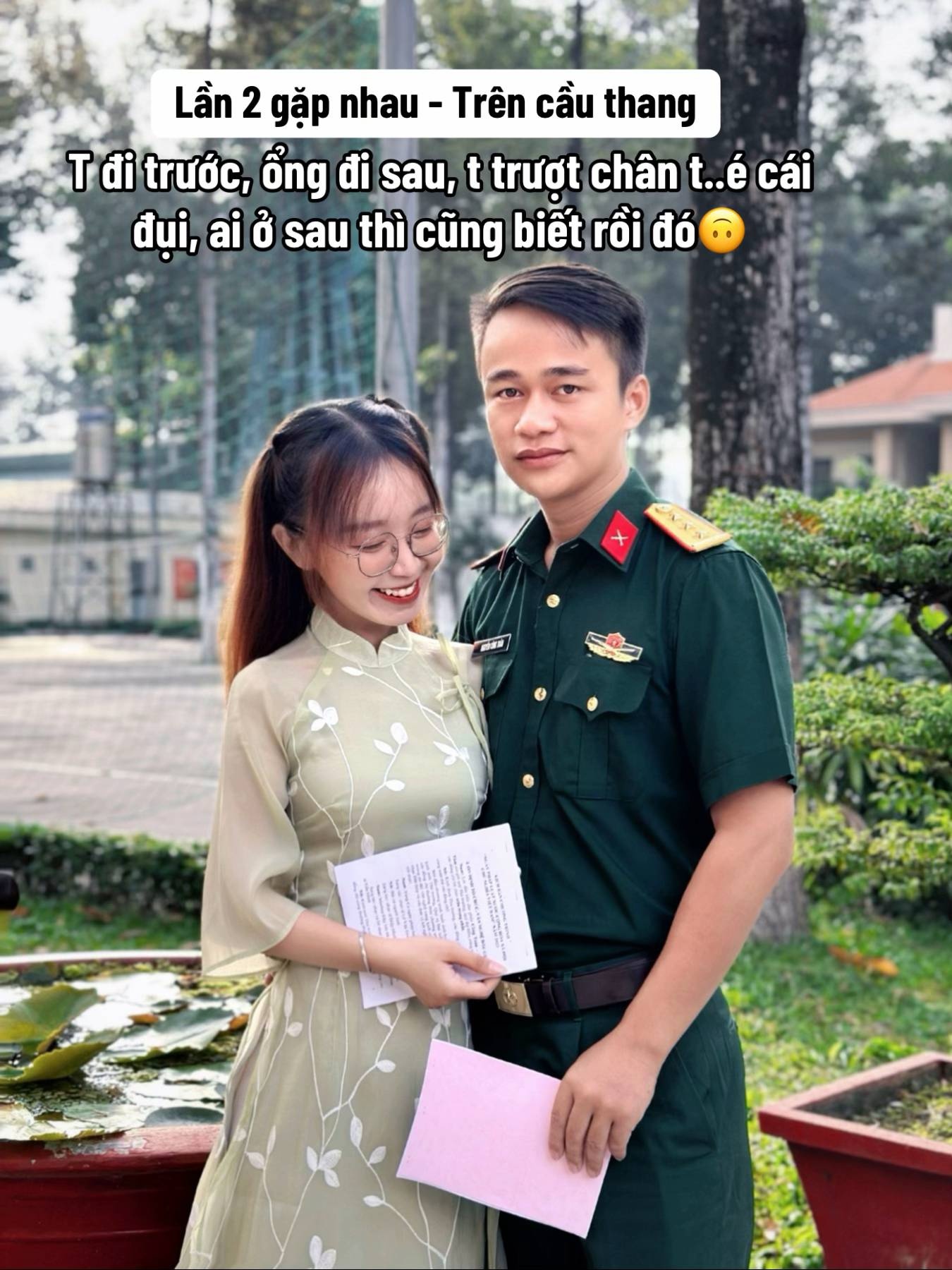 Lần thứ hai gặp nhau, Ngọc Tâm vừa leo cầu thang, vừa quay clip TikTok với bạn và không may trượt chân té ngược về phía sau. Trùng hợp, anh Toàn đi ngay đằng sau và đỡ kịp, ôm gọn cô vào lòng.