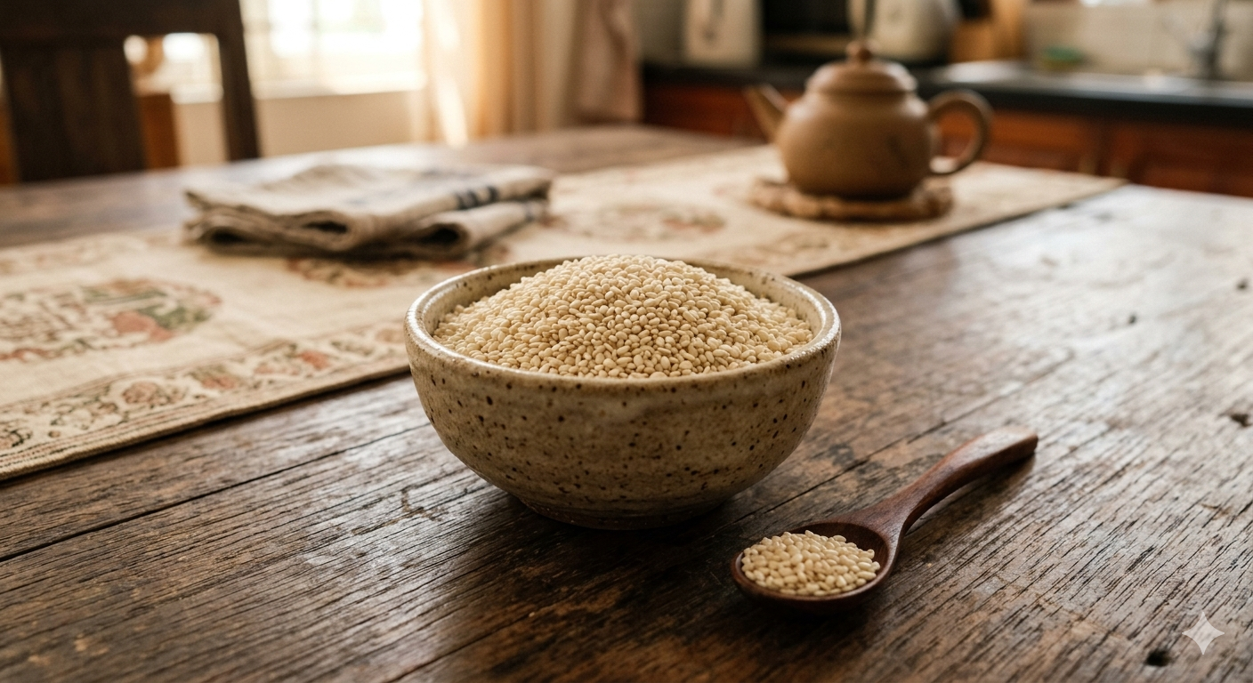 Những hạt mè nhỏ bé này chứa tới 975 mg canxi trên 100 gram cùng các khoáng chất như magiê, kẽm và phốt pho. Ảnh: AI.
