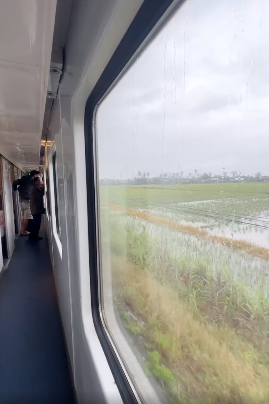 Long quyết định ở trên tàu thêm một đêm trong điều kiện điện và máy lạnh vẫn hoạt động bình thường. Qua cửa sổ, anh nhìn thấy nước dâng lên dọc đường ray. Một số hành khách sốt ruột đã tìm xe ôm để ra quốc lộ, tiếp tục hành trình bằng xe khách hoặc máy bay.