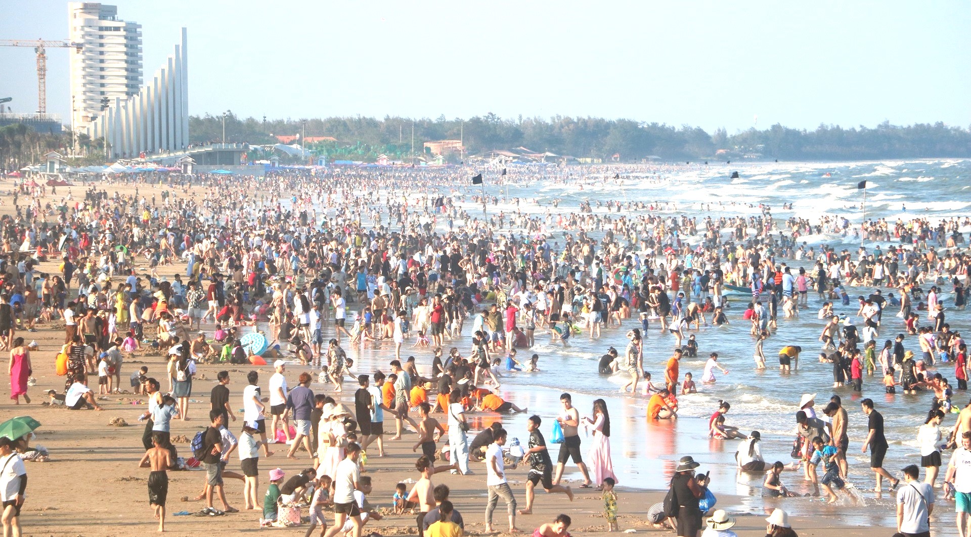 Để đảm bảo an toàn cho du khách trong điều kiện đông người, lực lượng cứu hộ túc trực liên tục dọc bãi biển, thường xuyên phát loa cảnh báo và nhắc nhở các trường hợp bơi vượt khu vực cắm cờ giới hạn, tập trung đông người ở vùng nước sâu hoặc tiềm ẩn nguy hiểm.