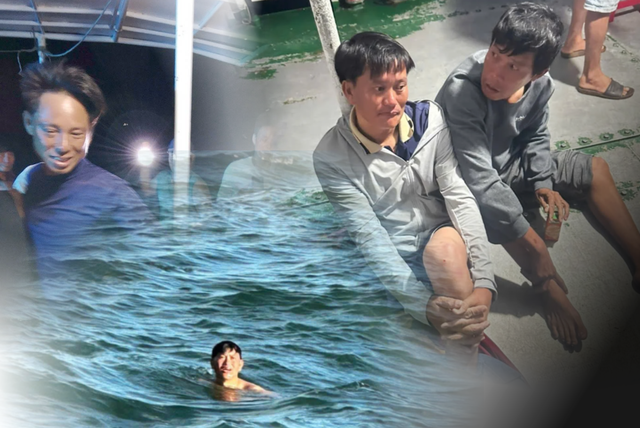 Sau 2 ngày trôi dạt trên biển, anh Quang, anh Sanh và Cường được phát hiện, ứng cứu.