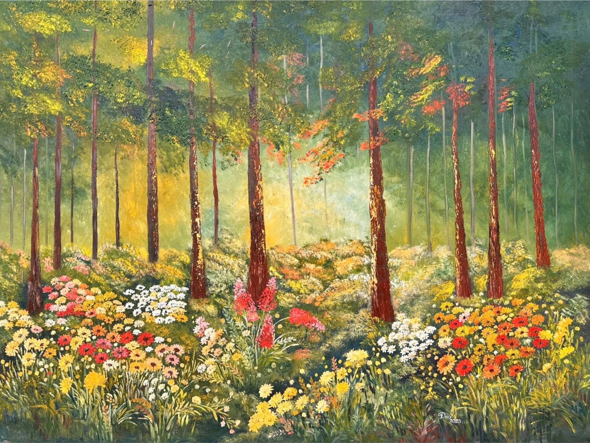 Trong đó, Anh Đào mang đến những bức tranh sơn dầu dịu dàng với mảng màu thanh, lớp pha sắc mỏng, cảm xúc trong và nhịp cọ tiết chế. Hoa trong tranh cô yên ổn như hơi thở đời sống ở núi rừng.