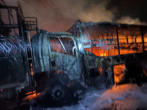 Vụ cháy không gây thương vong về người nhưng 2 xe tải bị thiêu rụi hoàn toàn, 1 xe bị thiêu rụi đầu ca bin.