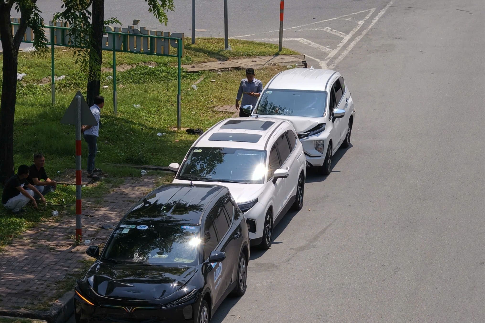Cú va chạm khiến ít nhất hai xe bị hư hỏng nặng phần đầu và đuôi, nắp capo biến dạng, chắn ngang một phần làn đường.