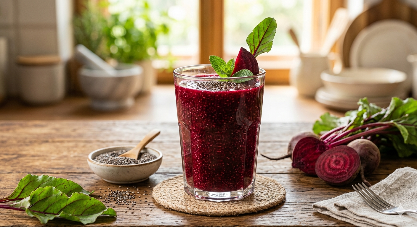 Nước ép củ dền kết hợp hạt chia cung cấp các chất dinh dưỡng và hợp chất thực vật có lợi cho sức khỏe. Ảnh: AI.