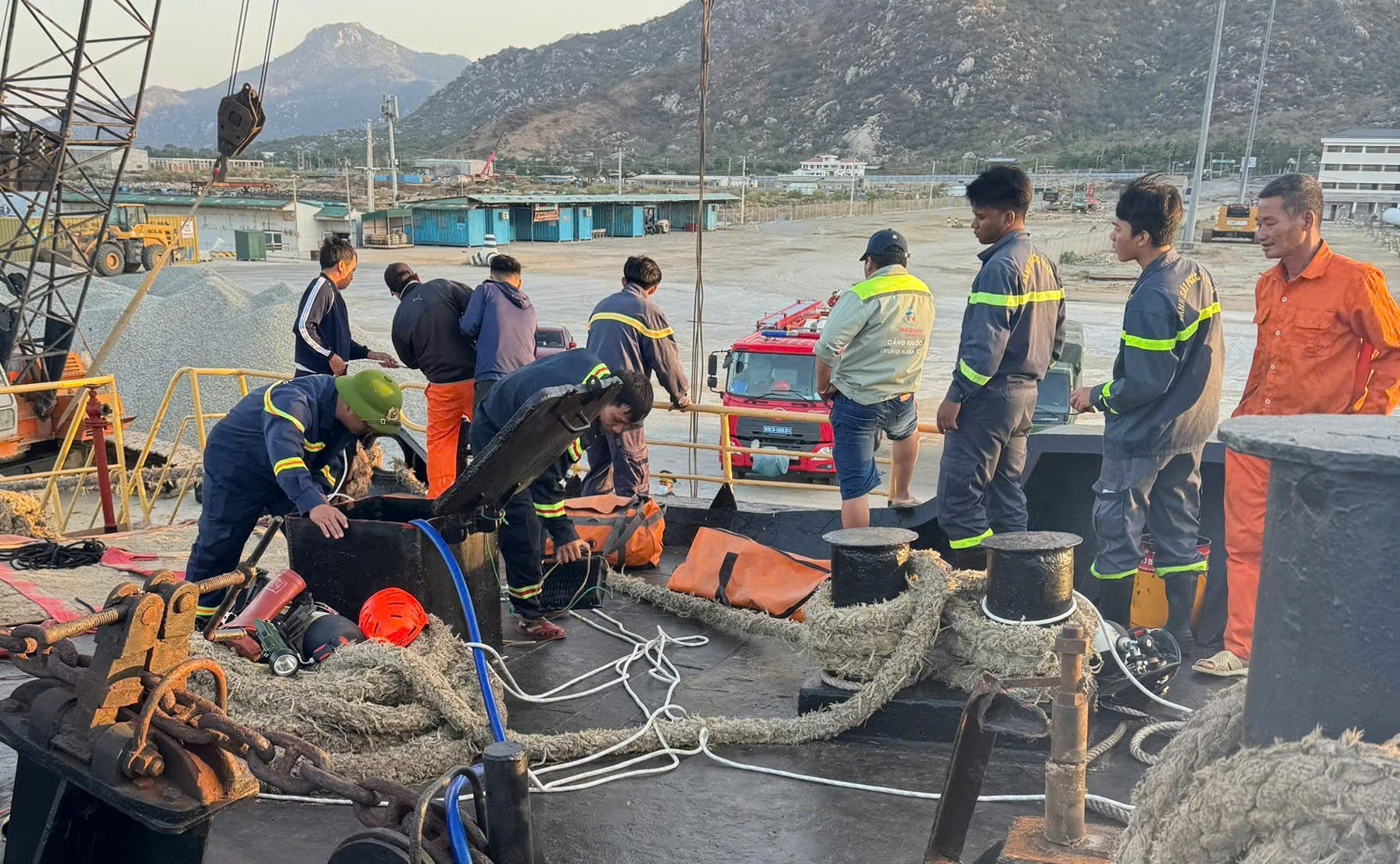 Đội Chữa cháy và Cứu nạn Cứu hộ Công an tỉnh Khánh Hòa triển khai lực lượng xuống hầm tàu đưa nạn nhân ra ngoài. Ảnh: C.A