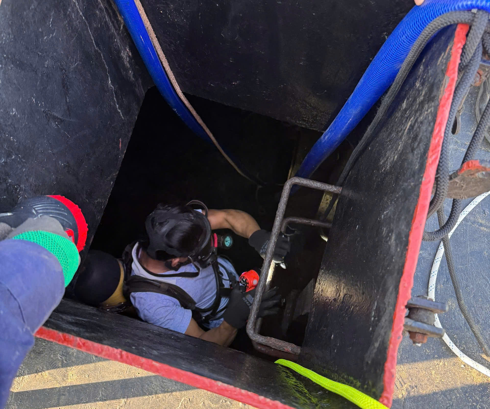 Riêng ông LVĐ vẫn còn mắc kẹt dưới hầm tàu tại két nước dưới khoang đáy. Khu vực này bị ngập nước, môi trường thiếu oxy nên không thể đưa nạn nhân ra ngoài.