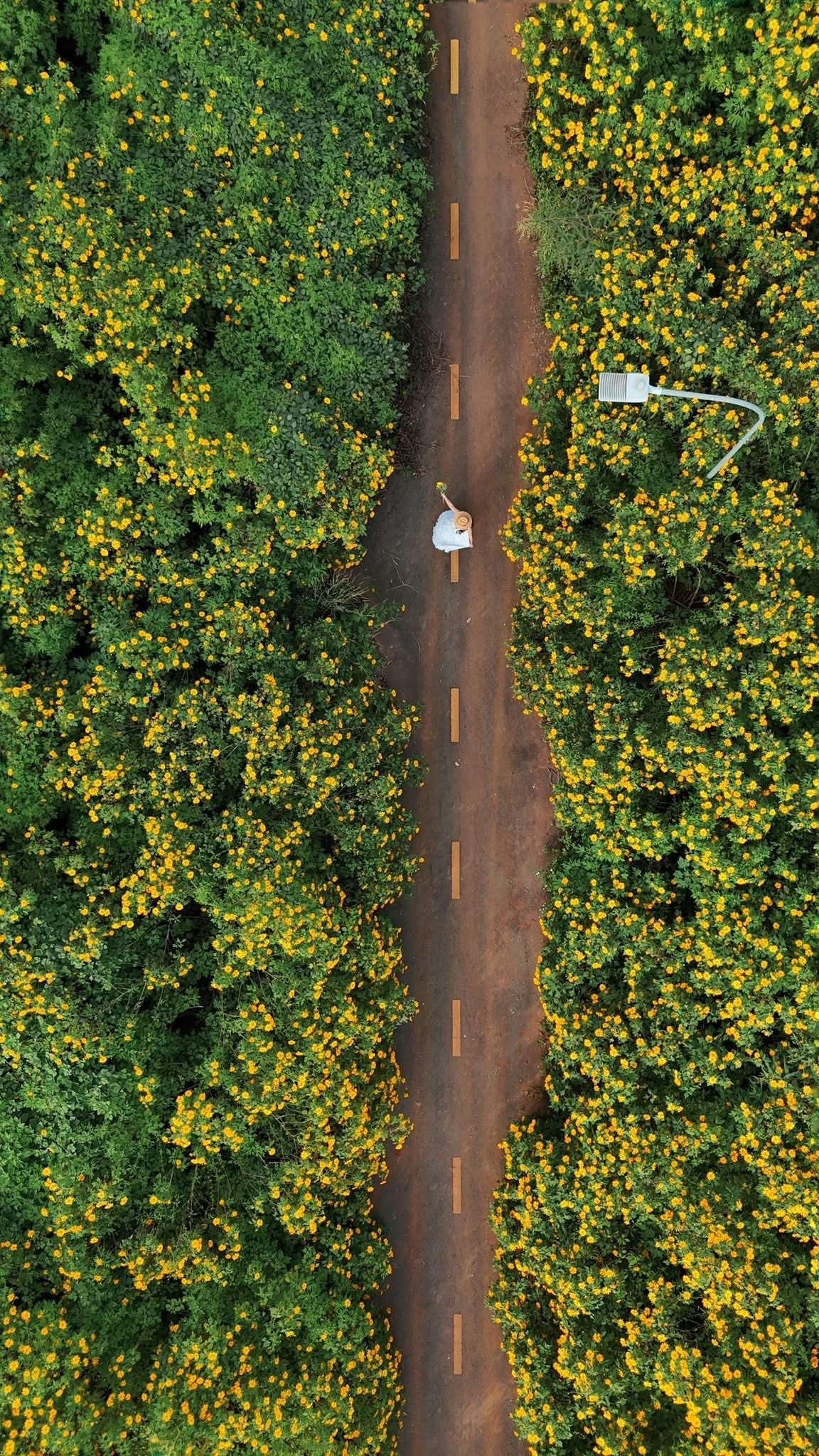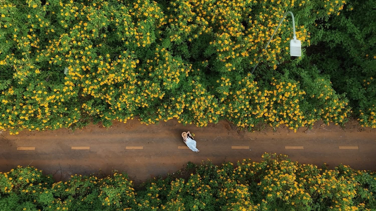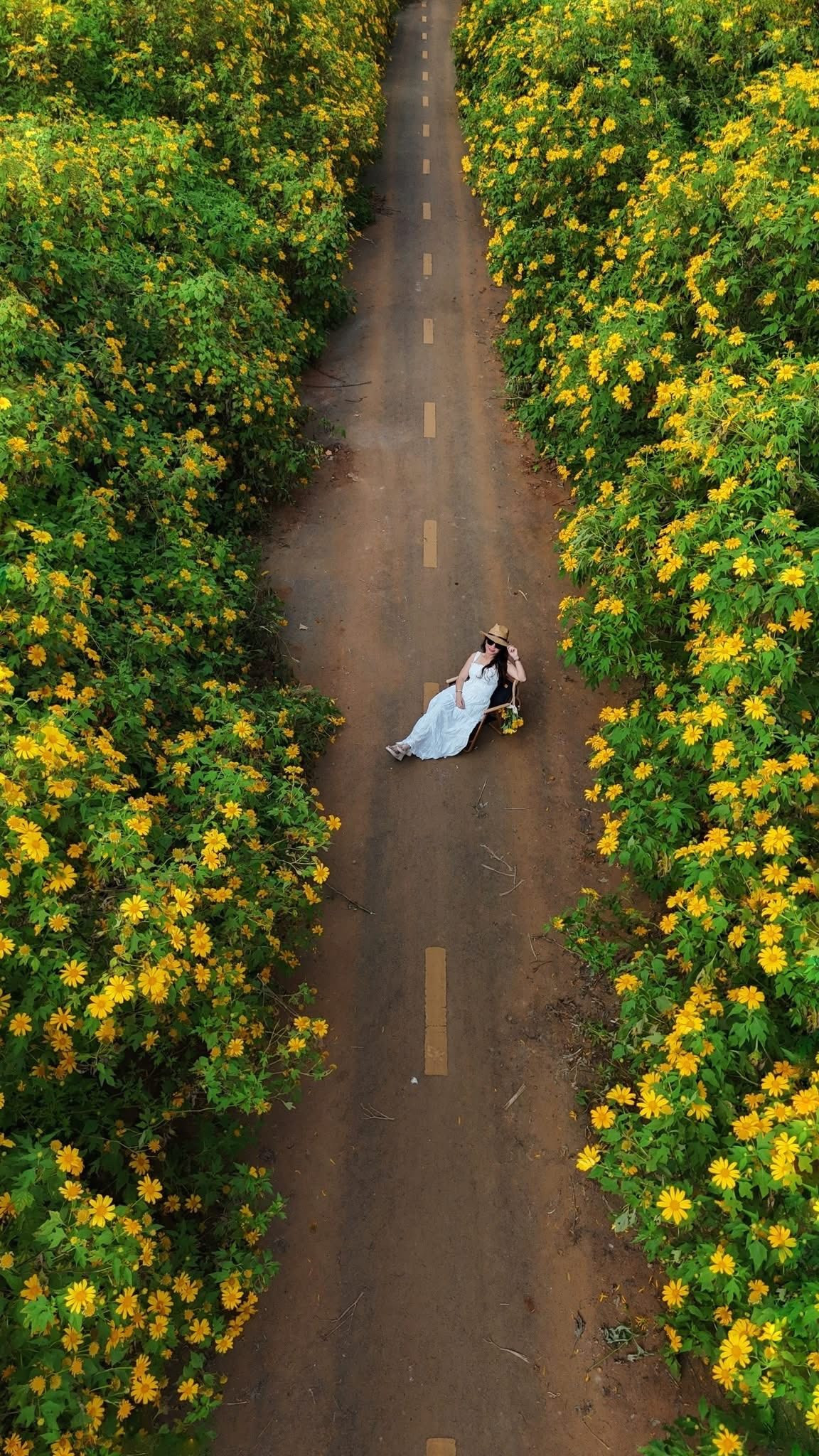 Hai bên đường là những dải dã quỳ trải dài, phù hợp chụp ảnh đối xứng, toàn cảnh hoặc concept thời trang. Khu vực gần Hồ Trên Mây là nơi lý tưởng để chụp flycam, ghi lại trọn vẹn sắc vàng bao phủ triền đồi. Ảnh Sam Sam