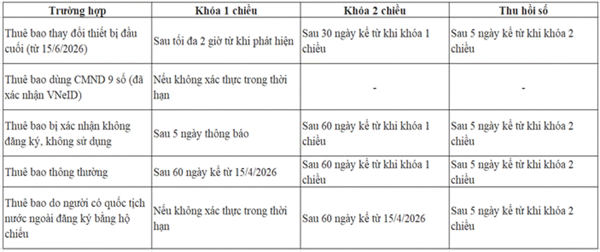Như vậy, các thuê bao di động không thực hiện xác thực thông tin sẽ bị khóa SIM theo các mốc thời gian dưới đây: