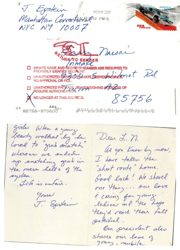 Theo Bộ Tư pháp, FBI đưa ra kết luận này vì chữ viết không giống của Epstein, bưu dấu cho thấy thư được gửi từ bang Virginia và sau thời điểm Epstein đã chết. Ngoài ra, địa chỉ người gửi không ghi nhà tù nơi Epstein bị giam giữ, cũng không có số tù nhân của ông ta – những thông tin bắt buộc đối với thư gửi ra từ trại giam.