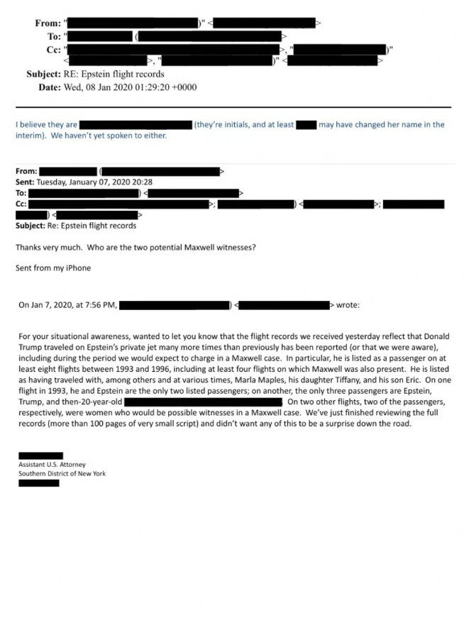Trong email đề ngày 7/1/2020, vị công tố viên không nêu tên viết rằng các hồ sơ bay cho thấy ông Trump đã bay trên máy bay riêng của Epstein 8 lần trong thập niên 1990. Trong số đó, có ít nhất 4 chuyến bay mà bà Ghislaine Maxwell – cộng sự thân cận của Epstein – cũng có mặt. Bà Maxwell hiện đang thụ án 20 năm tù vì giúp Epstein lạm dụng tình dục các bé gái vị thành niên.
