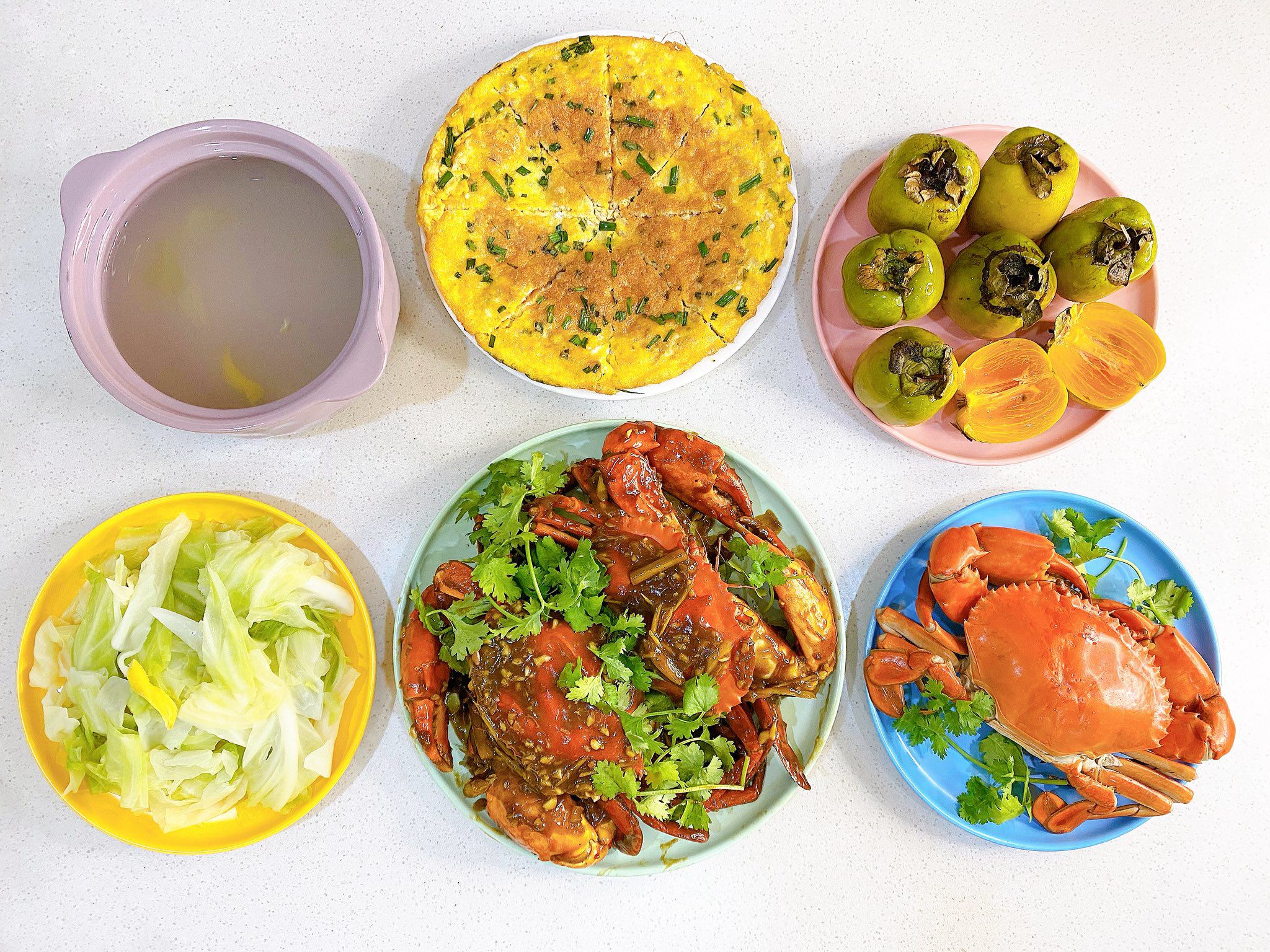 Cua rang me - Cua hấp - Trứng tráng thịt - Bắp cải luộc - Hồng da tre