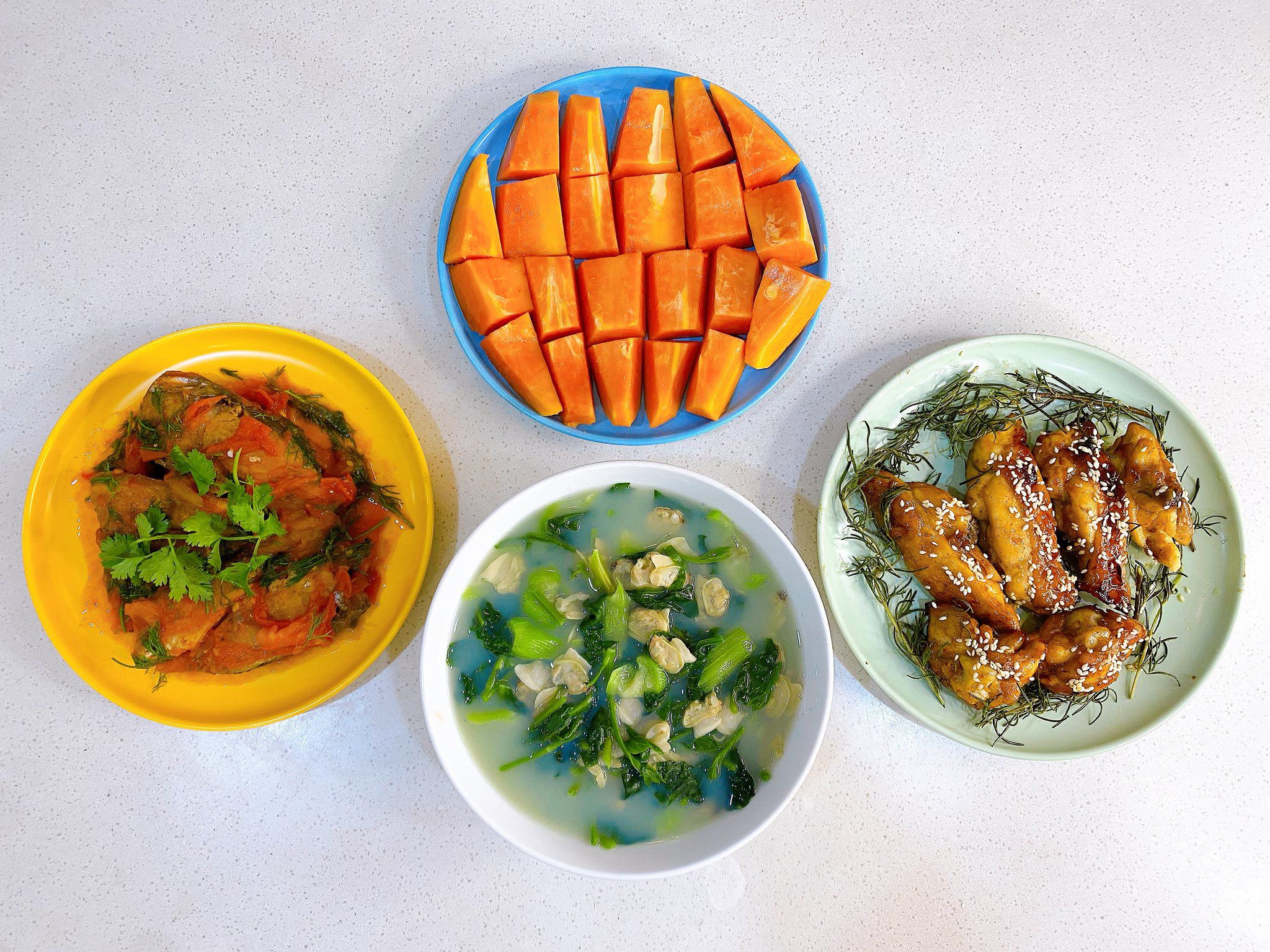 Má đùi gà nướng lá hương thảo - Cá thu sốt cà chua - Canh ngao mồng tơi - Đu đủ