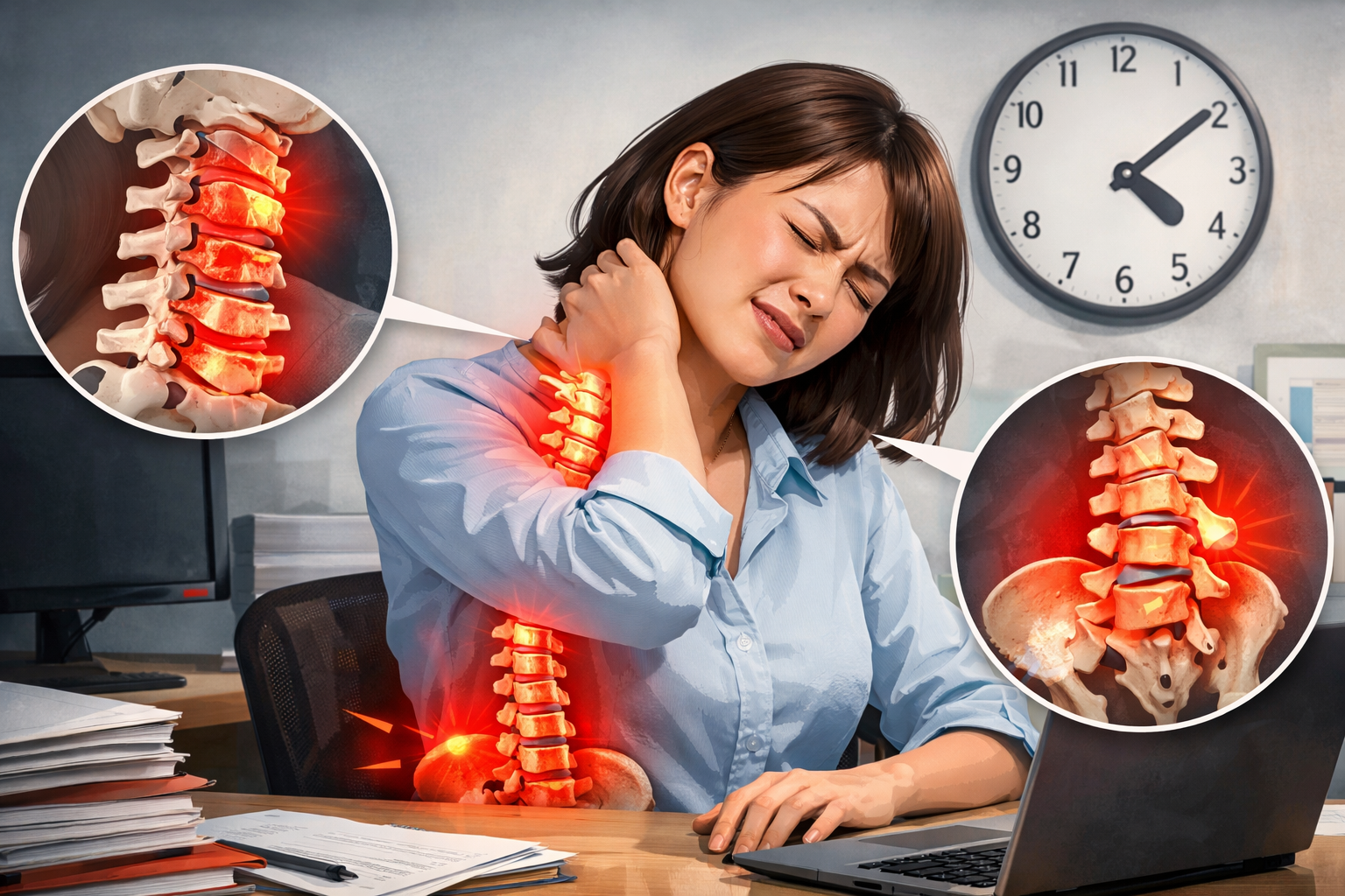 Ban đầu, T. chỉ cảm thấy mỏi cổ và vai gáy sau những giờ làm việc dài. Nhưng dần dần, những cơn đau lan xuống lưng khiến cô khó khăn khi cúi hay xoay người. Chưa kể tình trạng tê bì chân tay xuất hiện, nhất là khi ngồi lâu, ít vận động.