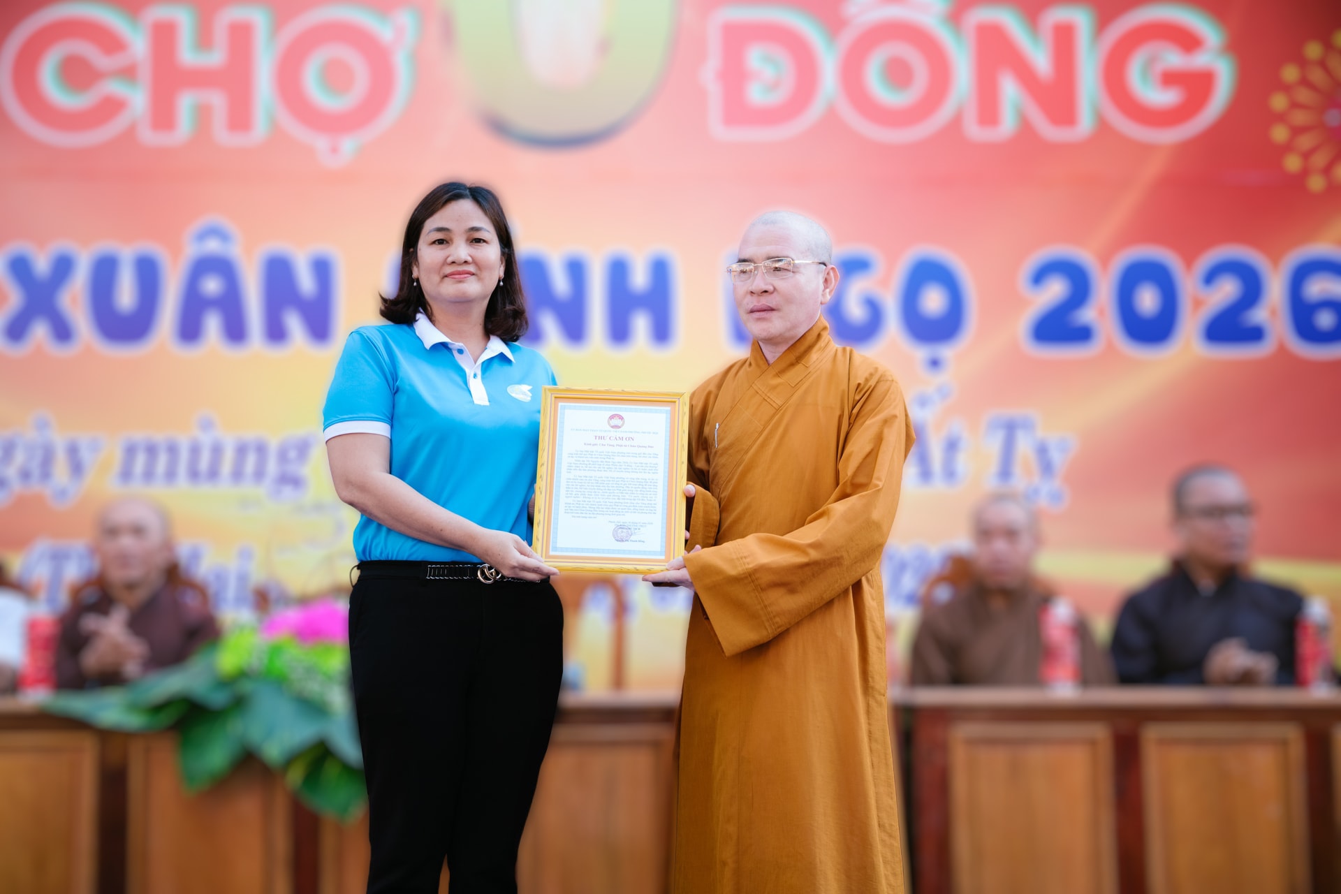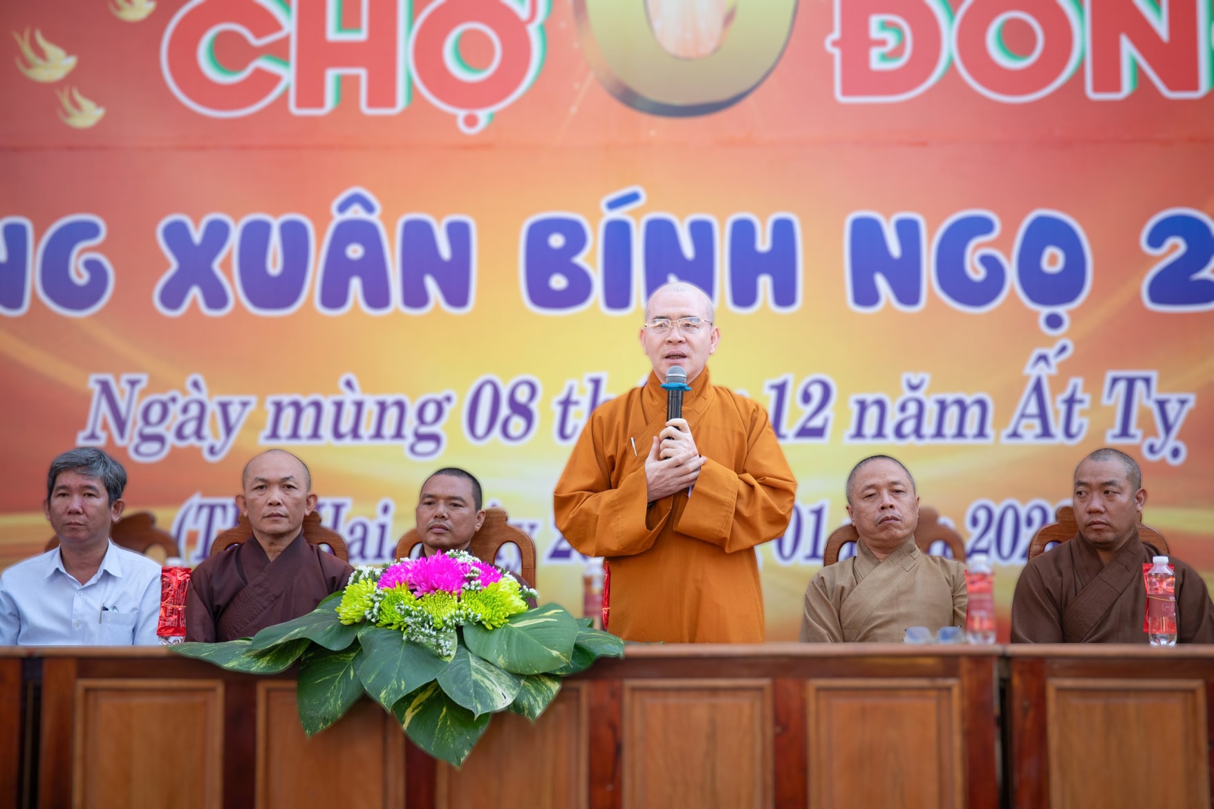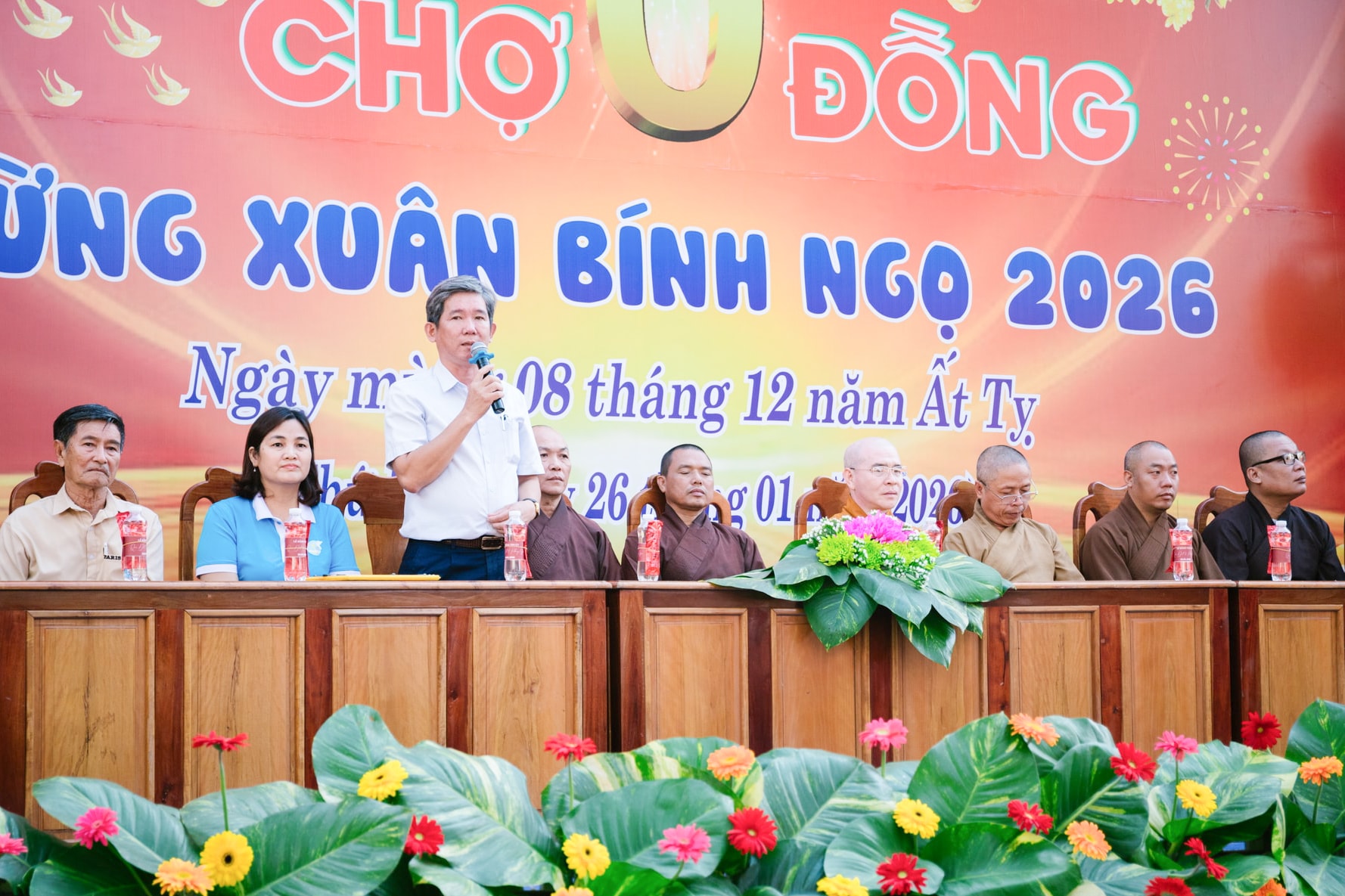 Thượng tọa Thích Đức Thành, Ủy viên Thường trực, Ban trị sự Phật giáo tỉnh Lâm Đồng, Phó Thường trực Ban Kiểm soát Phật giáo, trụ trì chùa Quảng Đức, Trưởng Ban tổ chức động viên tinh thần bà con trong dịp đến Phiên chợ 0 đồng mừng Xuân Bính Ngọ 2026
