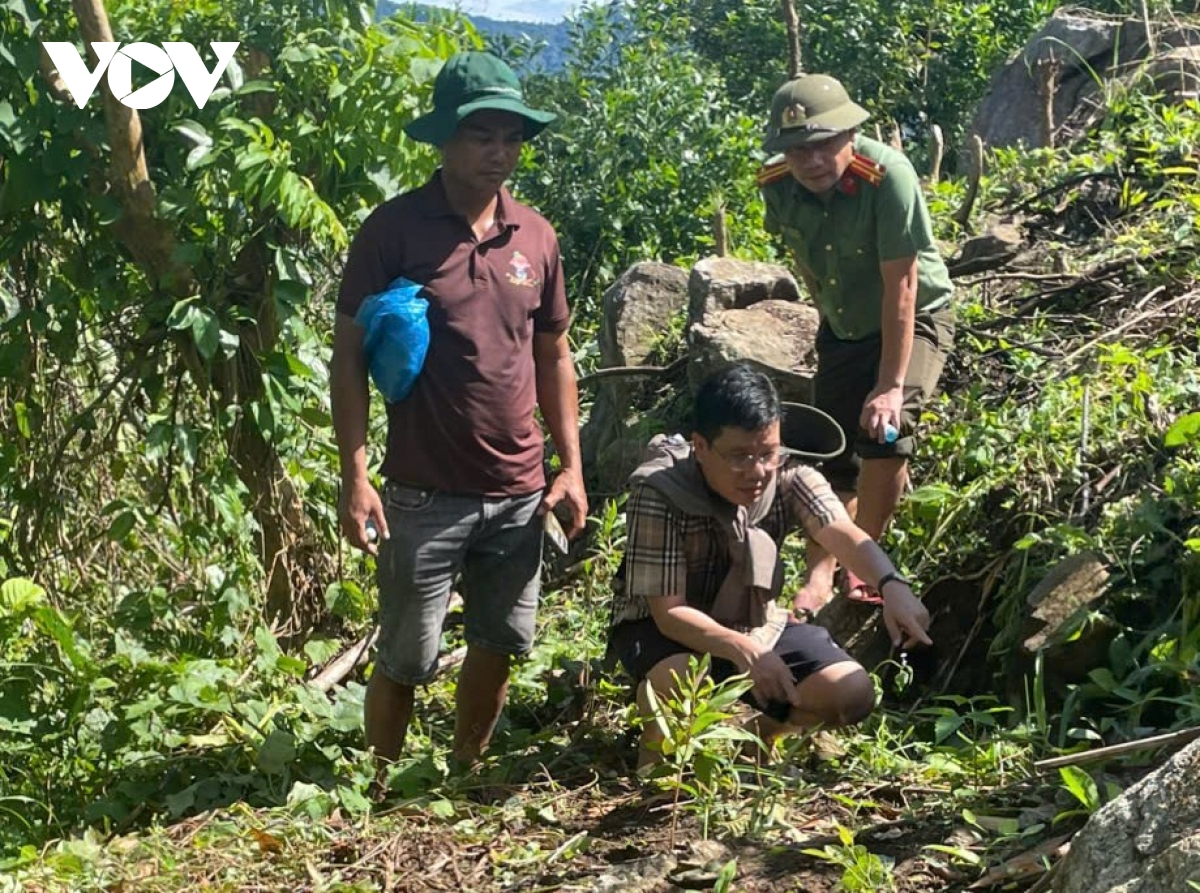 Tổ công tác UBND xã Ba Vì, tỉnh Quảng Ngãi kiểm tra vết nứt trên núi Wang Với.