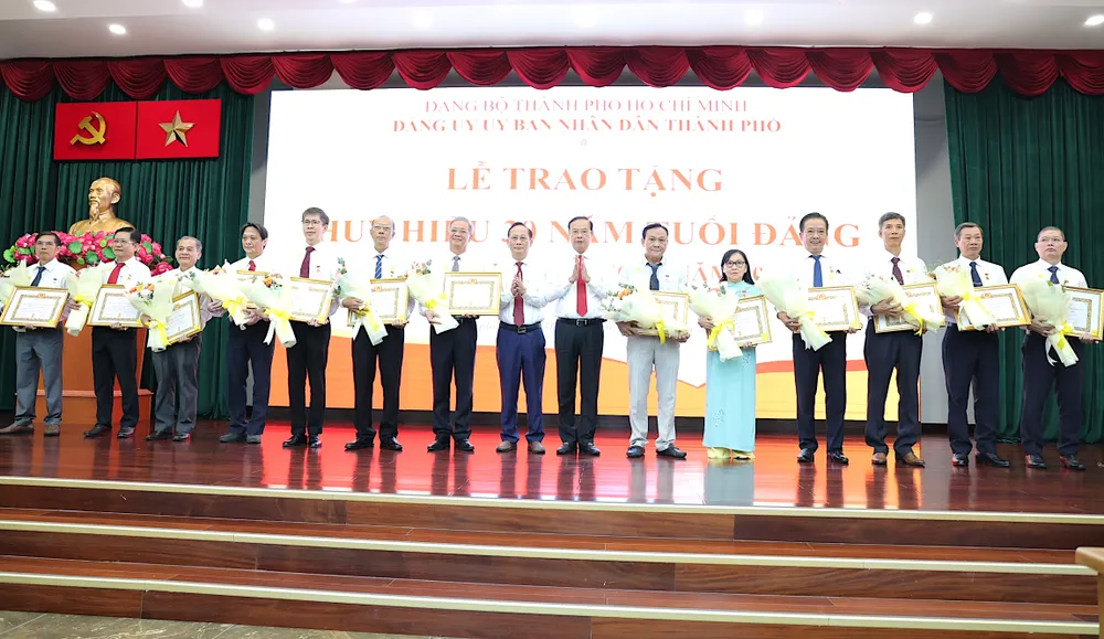 Dịp này, Đảng ủy UBND TP.HCM tổ chức trao Huy hiệu 50 năm, 45 năm, 40 năm và 30 năm tuổi Đảng cho 32 đảng viên.