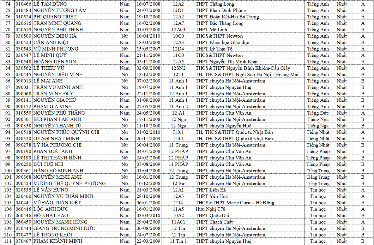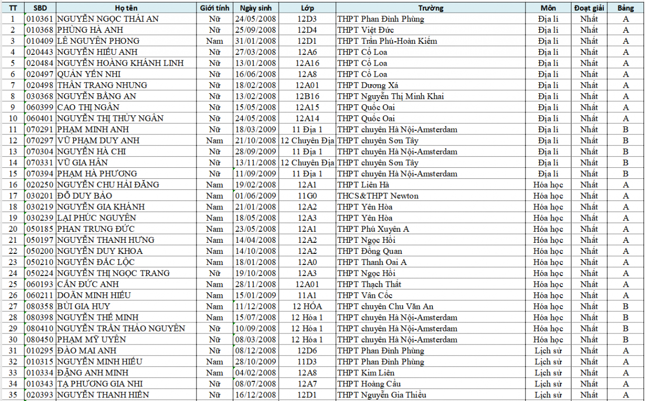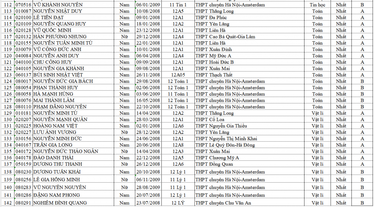 Sở GD&ĐT Hà Nội cũng công bố danh sách 142 thí sinh giành giải Nhất ở kỳ thi chọn học sinh giỏi cấp thành phố năm học 2025-2026:
