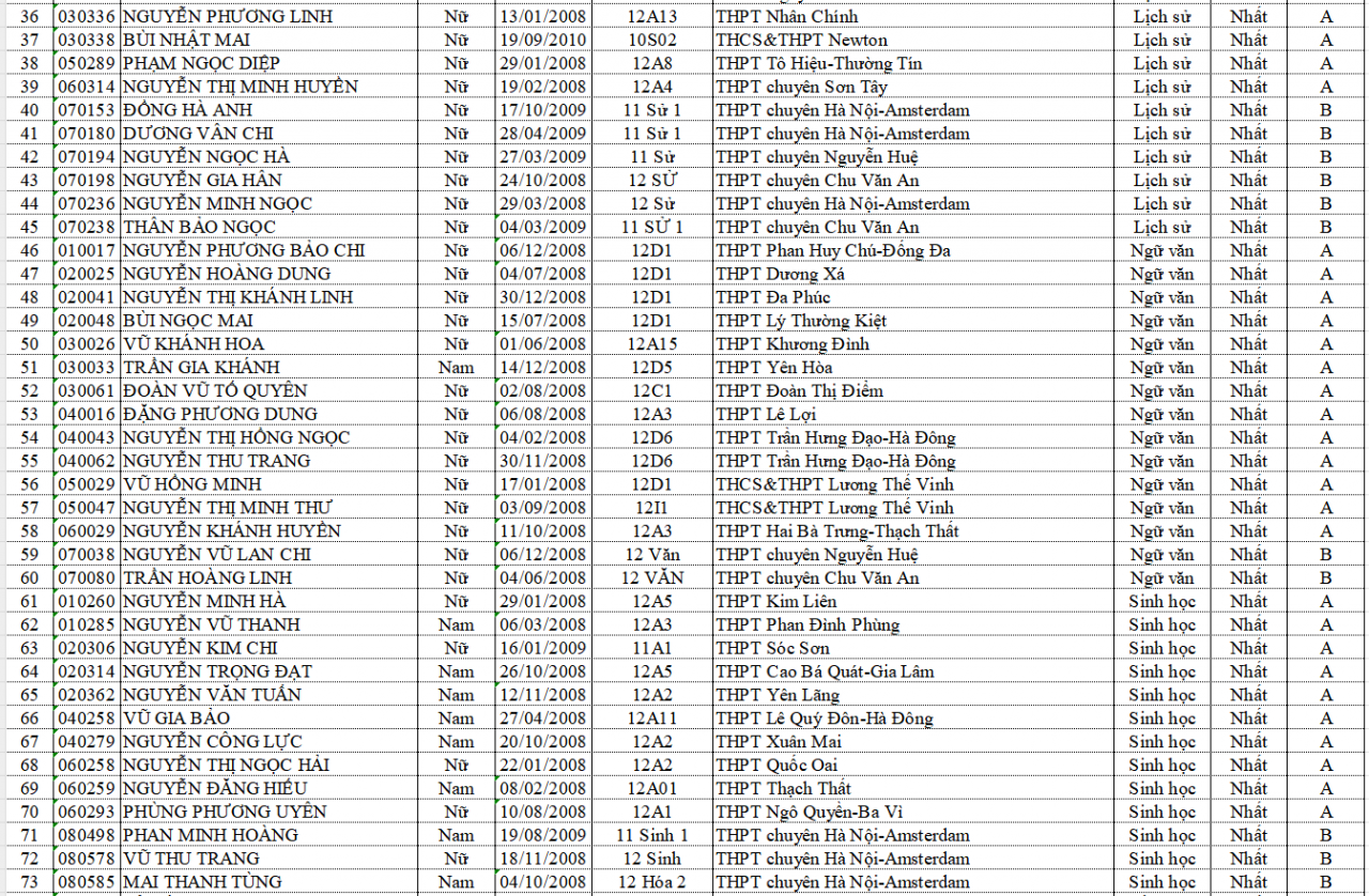 Trong số này, học sinh lớp 10 lọt vào đội tuyển của Hà Nội dự kỳ thi chọn học sinh giỏi quốc gia gồm: Nguyễn Đăng Khánh (lớp 10G0 của Trường THCS&THPT Newton; môn Toán); Vũ Quang Dũng (lớp 10 Toán 1 của Trường THPT chuyên Hà Nội -Amsterdam; môn Toán); Phạm Hồng Lương (lớp 10 Nhật của Trường THPT Chuyên Hà Nội - Amsterdam; môn Tiếng Nhật).