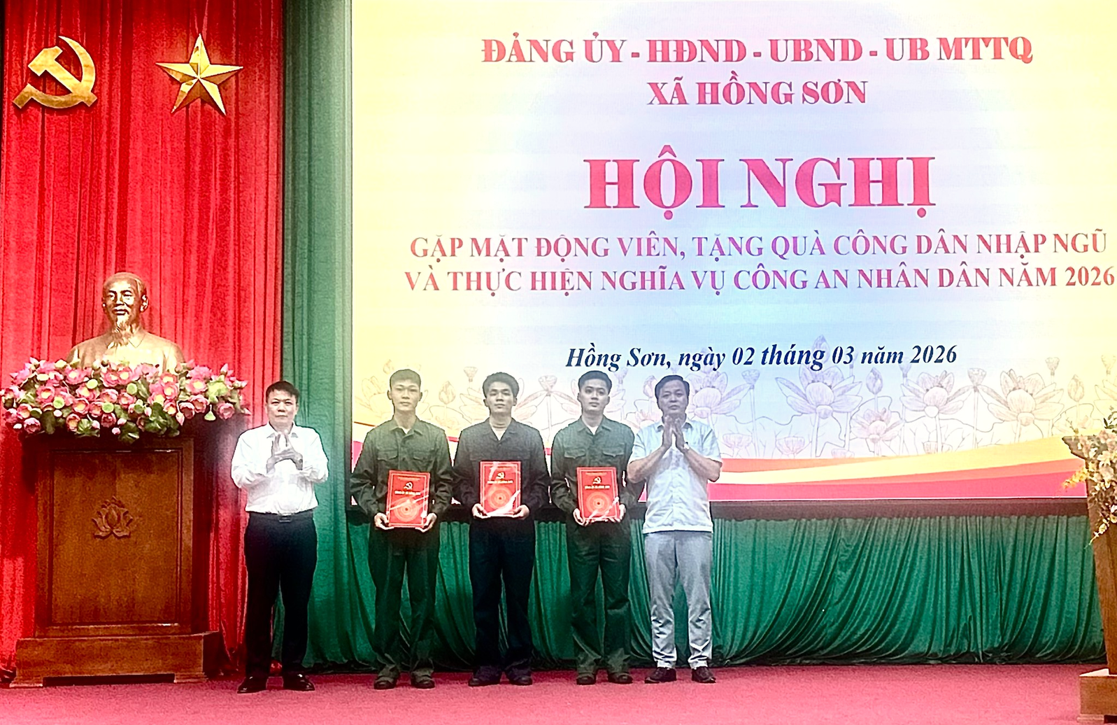 Nhân dịp này, lãnh đạo Đảng ủy, HĐND, UBND, Ủy ban MTTQ Việt Nam xã Hồng Sơn và các cơ quan, đơn vị đã trao quà động viên các công dân thực hiện nghĩa vụ quân sự và nghĩa vụ tham gia Công an nhân dân năm 2026.