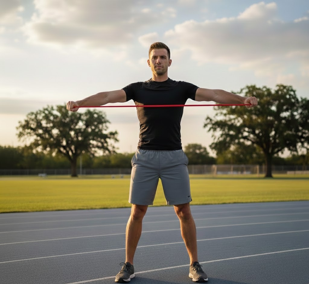 Kéo giãn với dây kháng lực là bài tập quan trọng giúp tăng cường nhóm cơ sau vai và lưng trên, vùng thường yếu đi theo tuổi tác.