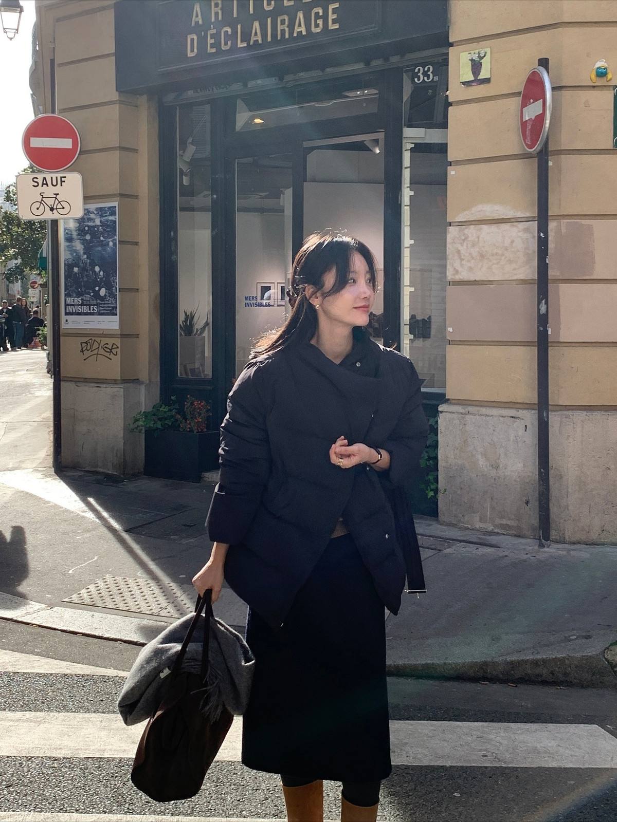 Áo phao dáng ngắn hoặc trung bình là “vũ khí” giữ ấm ngày lạnh. Kết hợp cùng quần âu dài hoặc chân váy midi giúp duy trì nét thanh lịch và kín đáo. Ảnh minh họa
