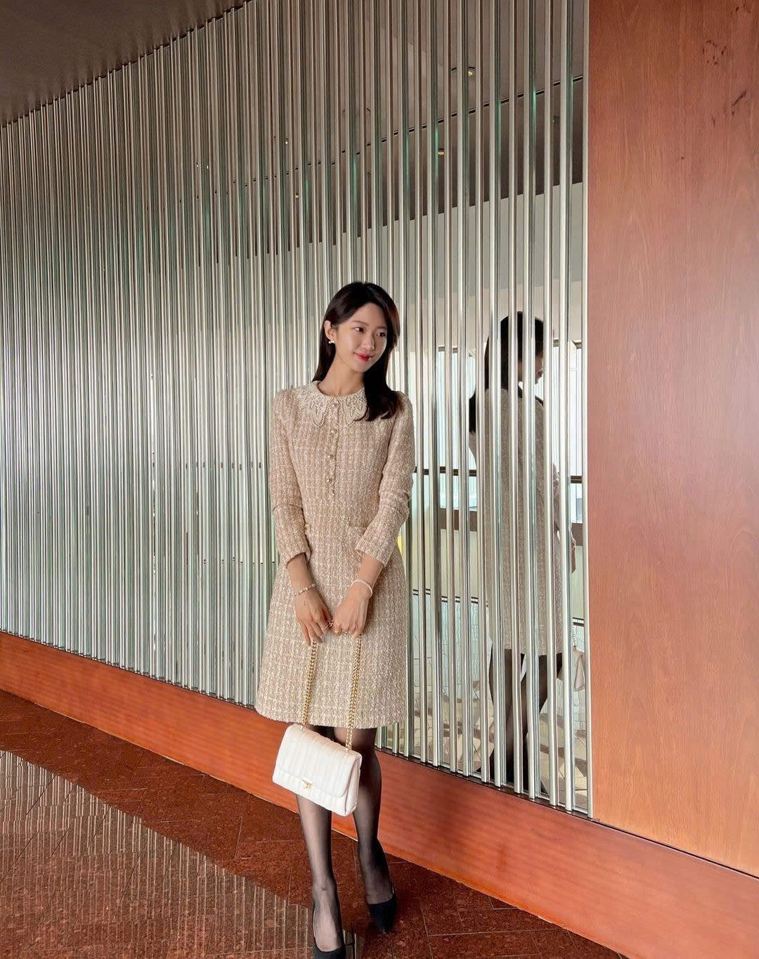 Váy công sở mùa đông nên ưu tiên chất liệu dày như tweed, wool hay vải dạ. Váy liền dáng ôm vừa phải giúp tôn dáng mà vẫn giữ ấm. Ảnh minh họa