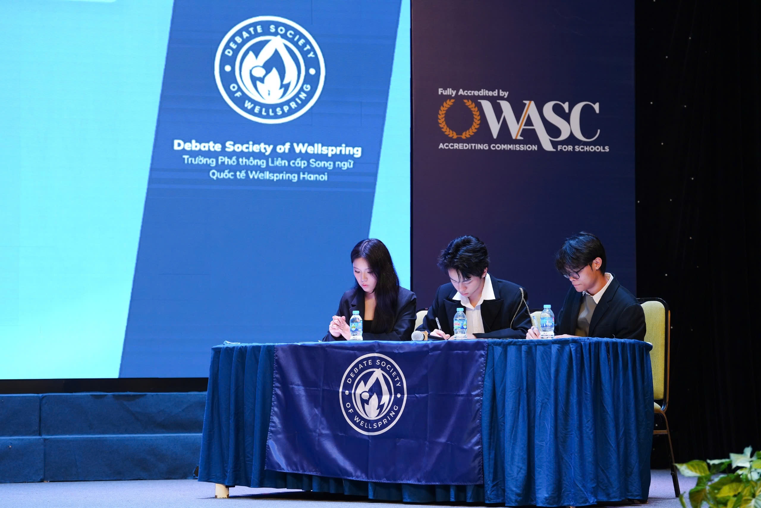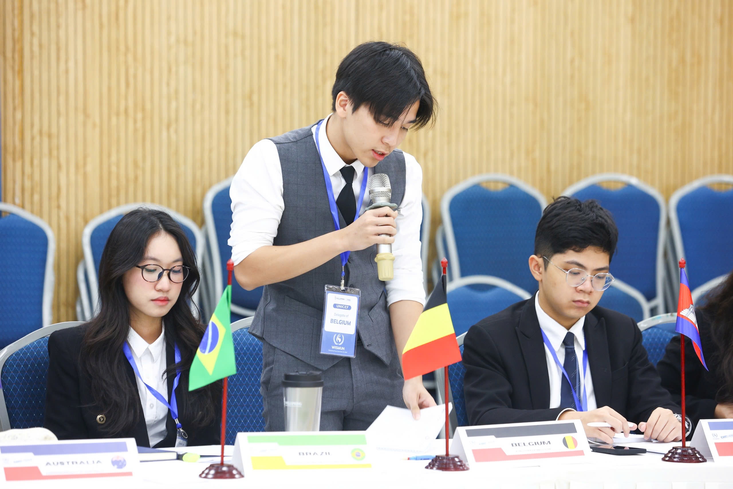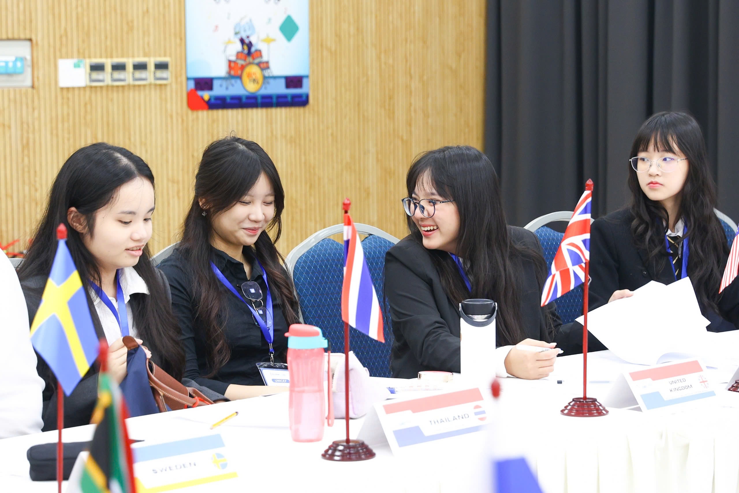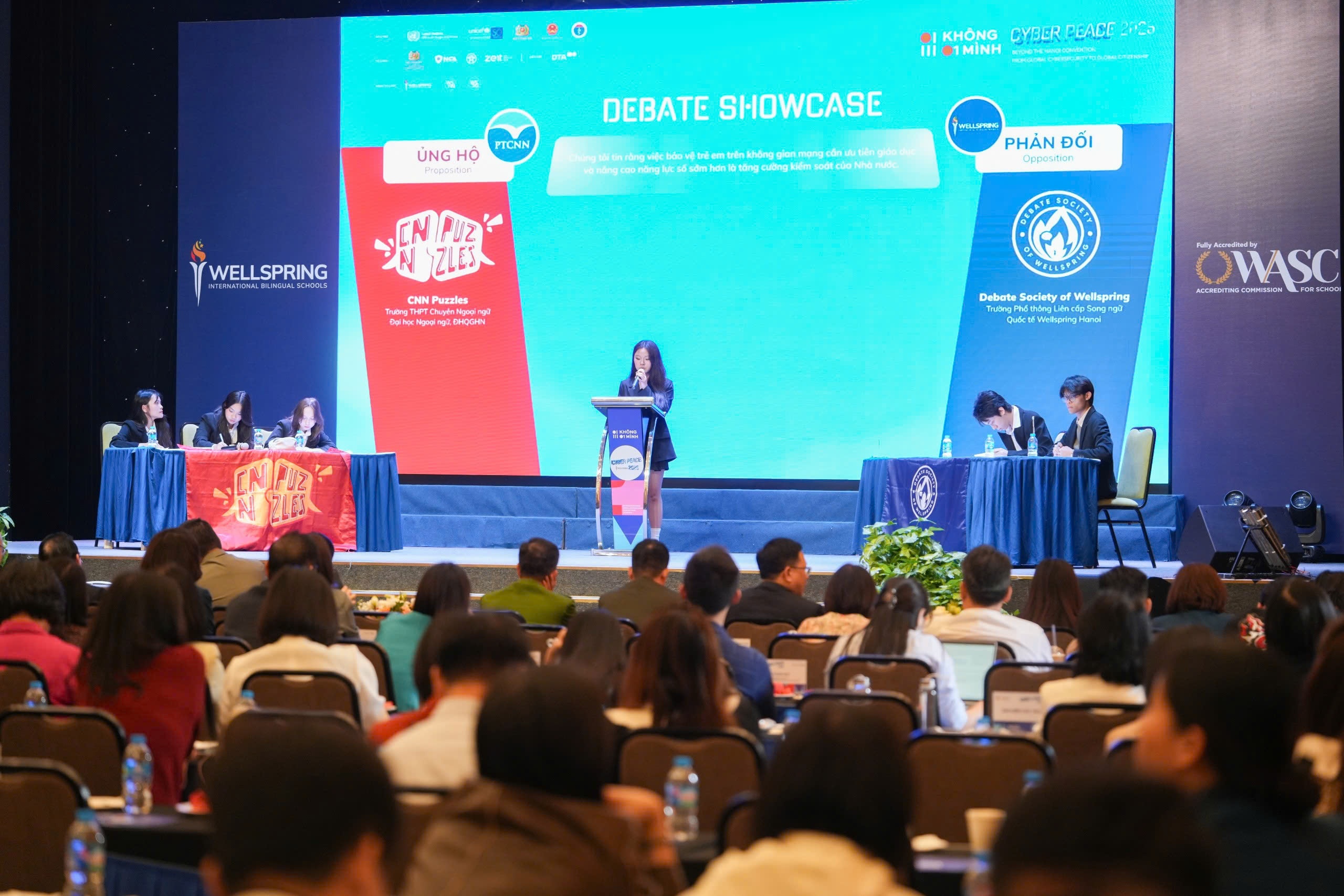 Học sinh tham gia tranh biện, đóng vai các phái đoàn quốc phân tích, thảo luận về các tình huống an ninh mạng, quyền trẻ em số, dữ liệu cá nhân... Ảnh: BTC.